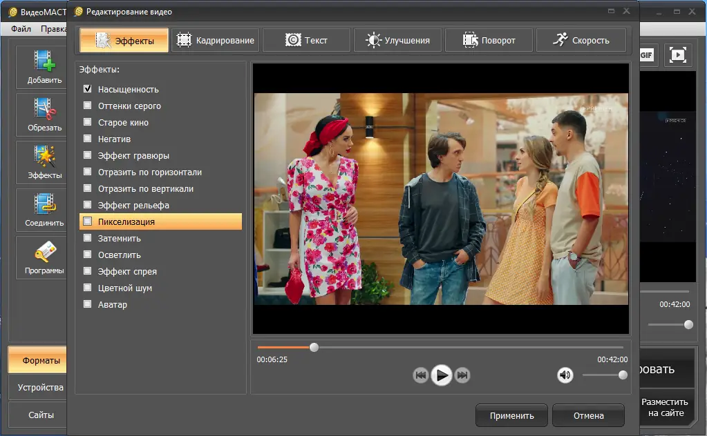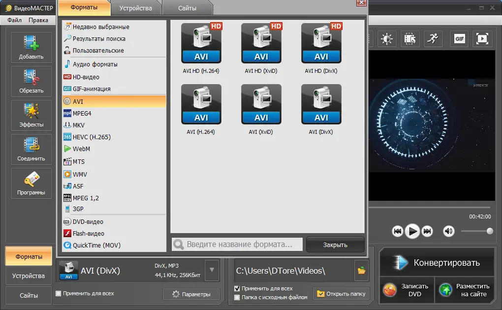 ВидеоМАСТЕР — это универсальный инструмент для конвертации, редактирования и записи видеозаписей, поддерживающий более 320 форматов и готовых пресетов для устройств и платформ. Программа сочетает в себе мощные функции преобразования видео, извлечения аудио и публикации контента с интуитивным интерфейсом на русском языке.