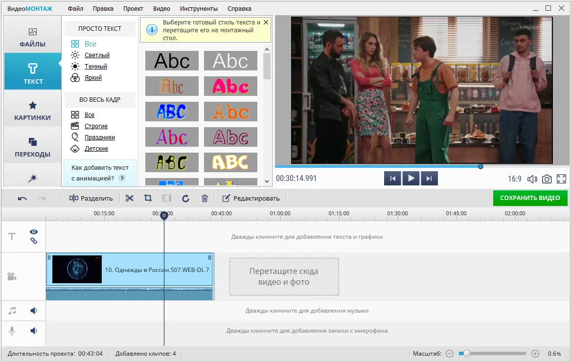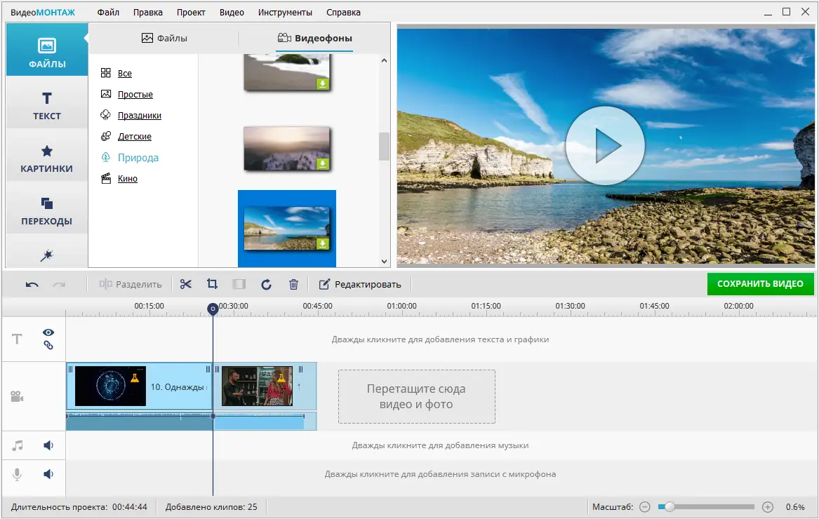 ВидеоМОНТАЖ — это мощное приложение, разработанное для удобного и быстрого редактирования видео на компьютере. Оно позволяет собирать полноценные фильмы из фото, видеозаписей и музыки, применяя эффекты, переходы и титры без необходимости изучать сложные инструменты.