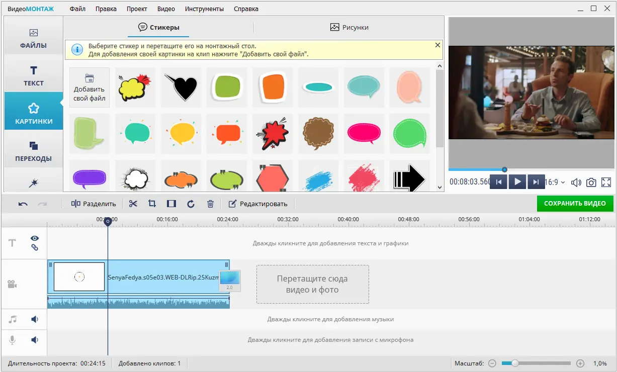 ВидеоМОНТАЖ — это простой и мощный видеоредактор, позволяющий создавать качественные видео с эффектами, переходами, титрами и музыкой за несколько шагов. Программа подходит как для начинающих, так и для тех, кто хочет быстро оформить домашние записи или монтаж из фото и видео. Интерфейс на русском языке делает процесс интуитивно понятным даже без специальных навыков.