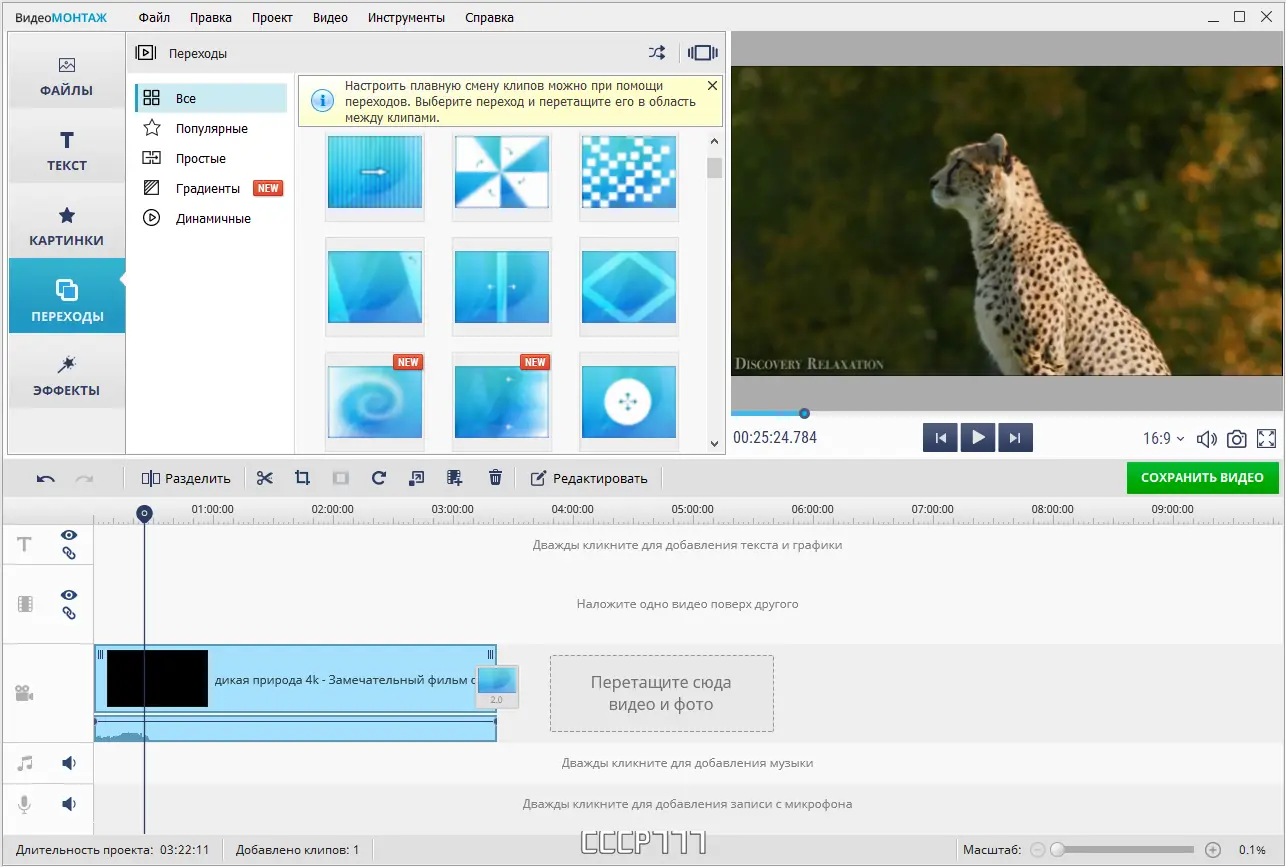 - Встроенные шаблоны переходов и титров помогают придать видео профессиональный вид за минимальное время.