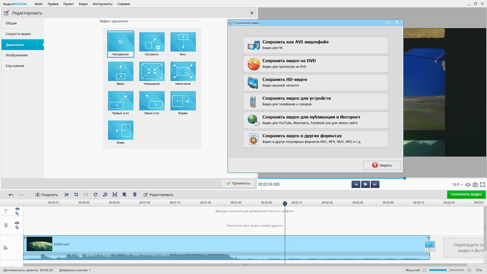- Экспорт в Full HD, создание DVD и публикация в соцсетях