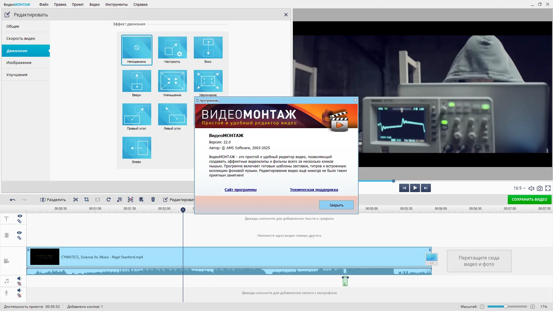 ВидеоМОНТАЖ — это простой и мощный видеоредактор, позволяющий быстро создавать качественные ролики из фото и видео с эффектами, музыкой и титрами. Программа подходит как новичкам, так и пользователям с базовыми навыками монтажа. С её помощью можно редактировать записи с камер, смартфонов и планшетов, применяя фильтры, переходы и настройки экспорта под любые устройства.