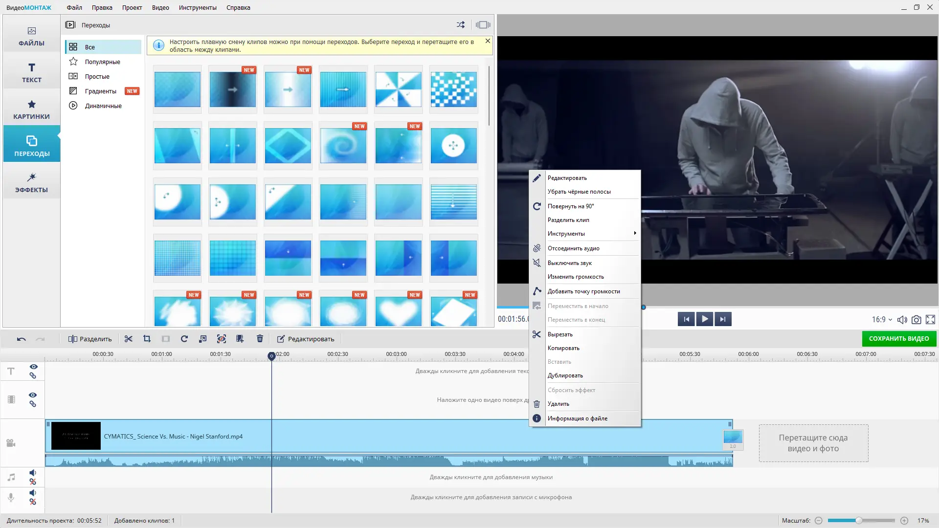 - Большая библиотека анимированных переходов и визуальных эффектов для динамичного монтажа