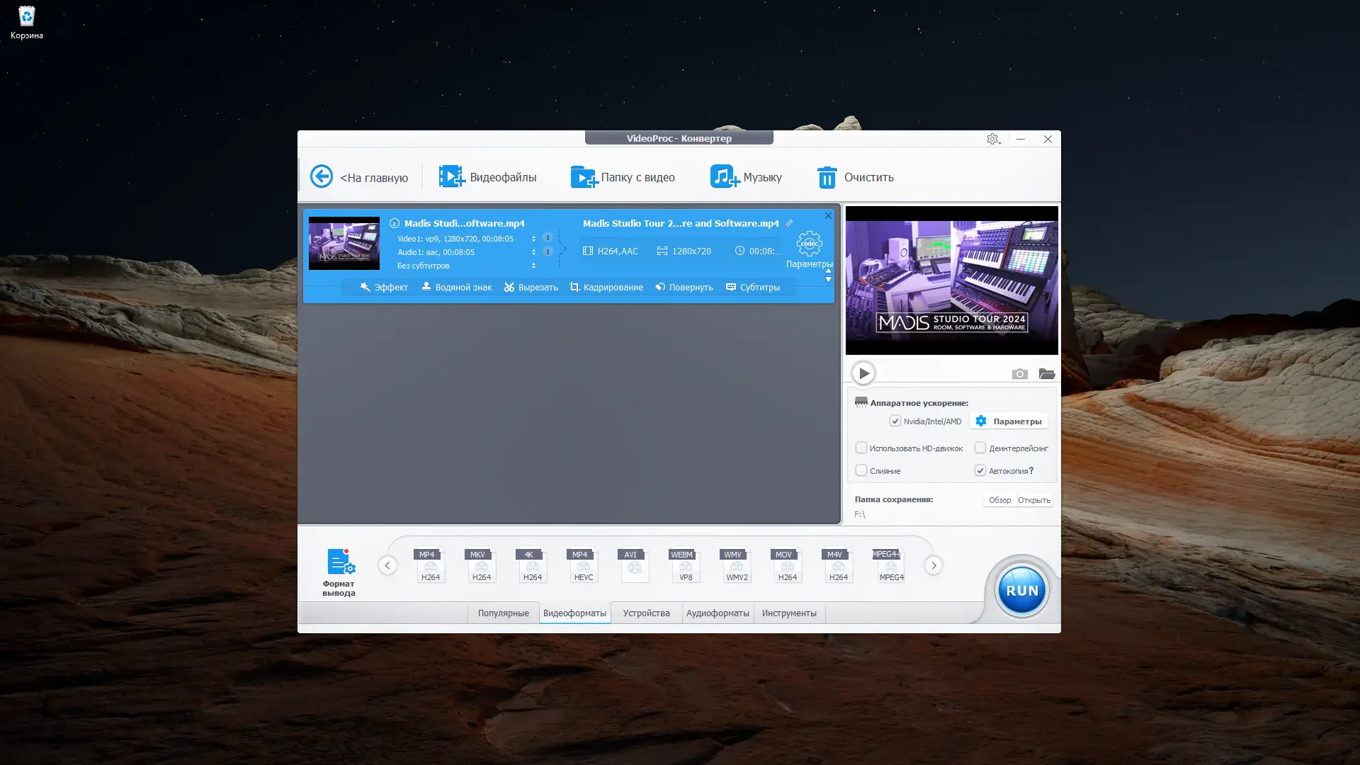 - Высокая скорость обработки за счёт поддержки Intel QSV, NVIDIA CUDA и AMD