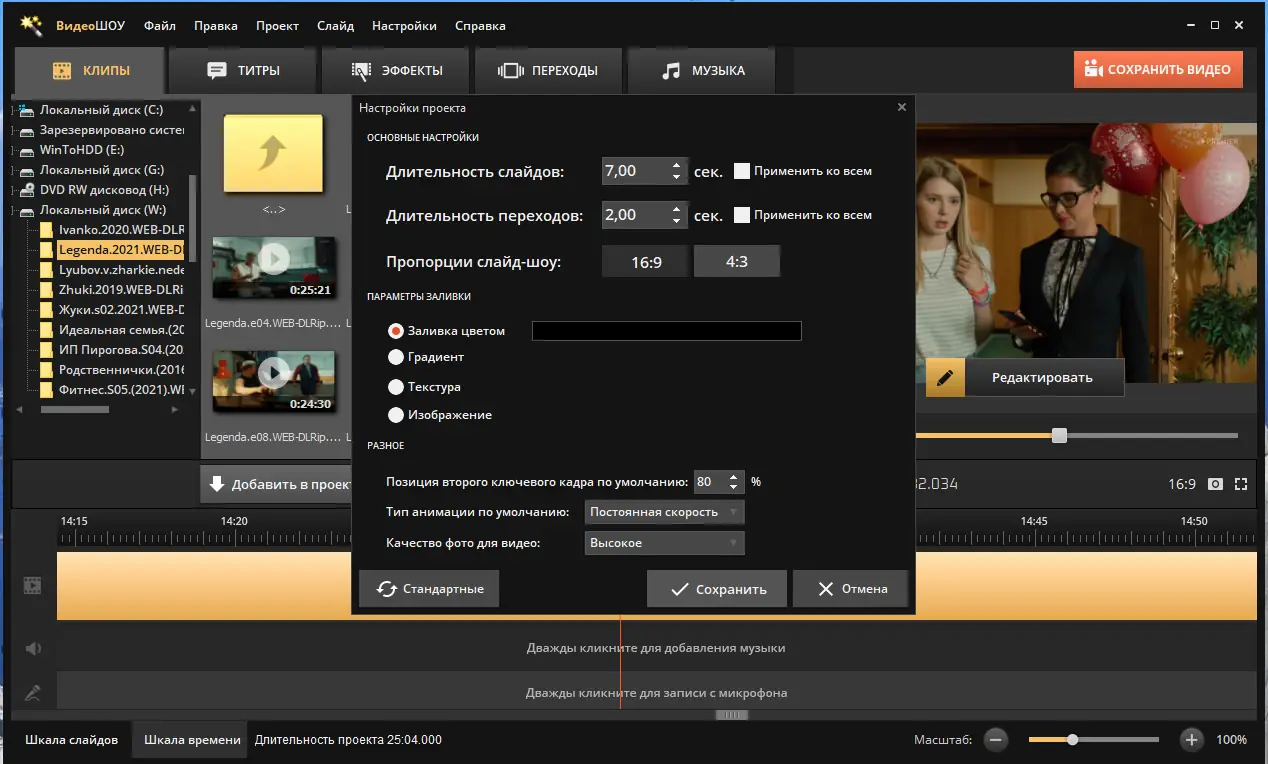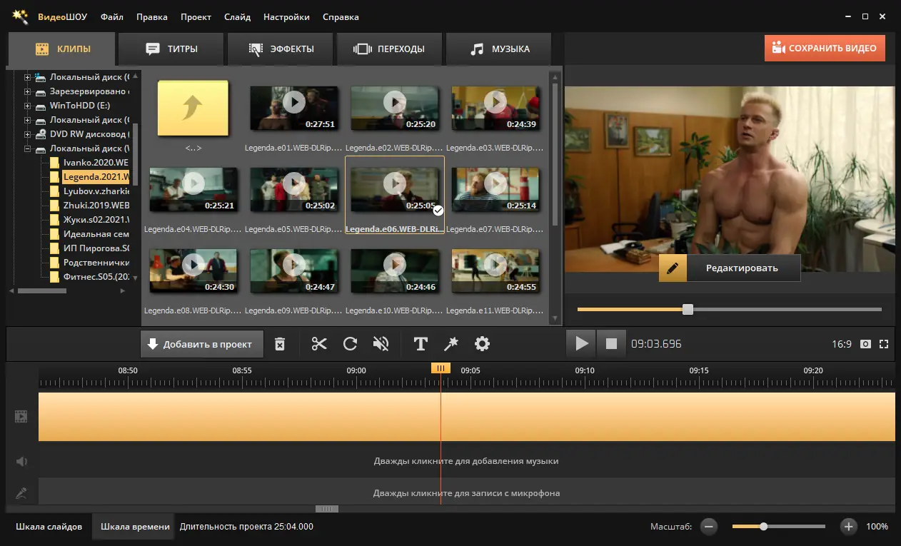 ВидеоШОУ позволяет создавать зрелищные видео без навыков монтажа — достаточно добавить медиафайлы и выбрать шаблон.