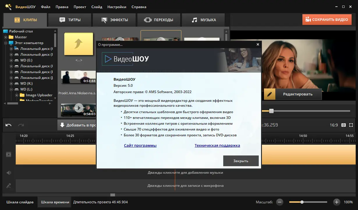 ВидеоШОУ — это мощный видеоредактор на русском языке, позволяющий создавать профессиональные видеоролики без специальных навыков. Программа сочетает в себе простоту интерфейса и широкие возможности для монтажа, озвучки, добавления эффектов и экспорта в различные форматы.
