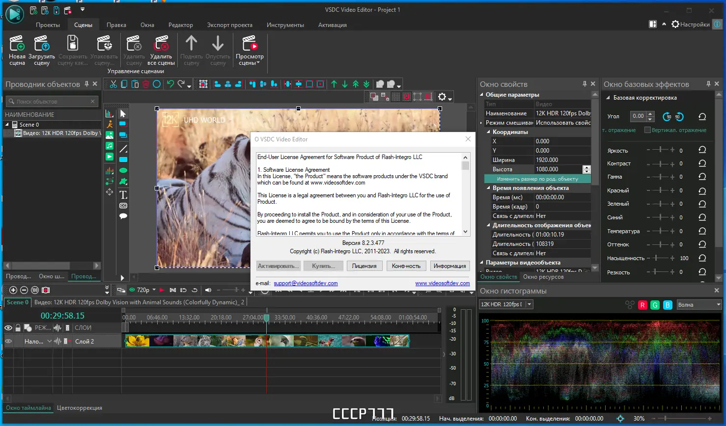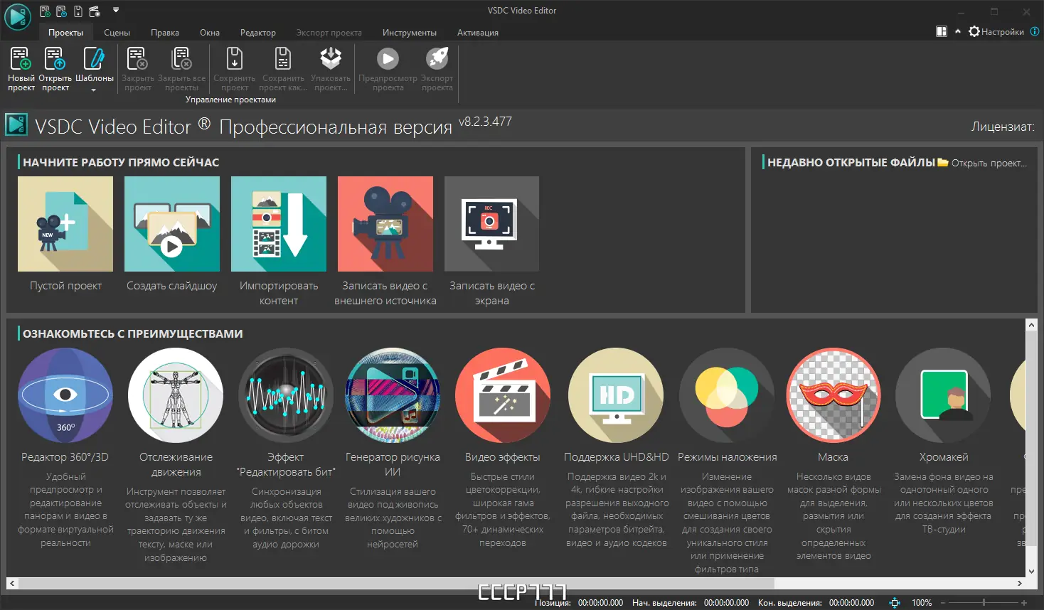 VSDC Video Editor — это программное обеспечение для монтажа видео, сочетающее в себе функциональность профессиональных решений и доступность для пользователей с разным уровнем подготовки. Программа работает с файлами высокого разрешения, включая 4K и 360-градусные видео, и позволяет создавать сложные композиции с использованием нескольких слоёв, эффектов и анимации. Особое внимание уделено оптимизации производительности — благодаря аппаратному ускорению, рендеринг происходит быстро даже при работе с тяжёлыми проектами. Редактор поддерживает широкий набор инструментов, включая режимы наложения, кривые Безье и HSL Chroma Key, что расширяет творческие возможности.