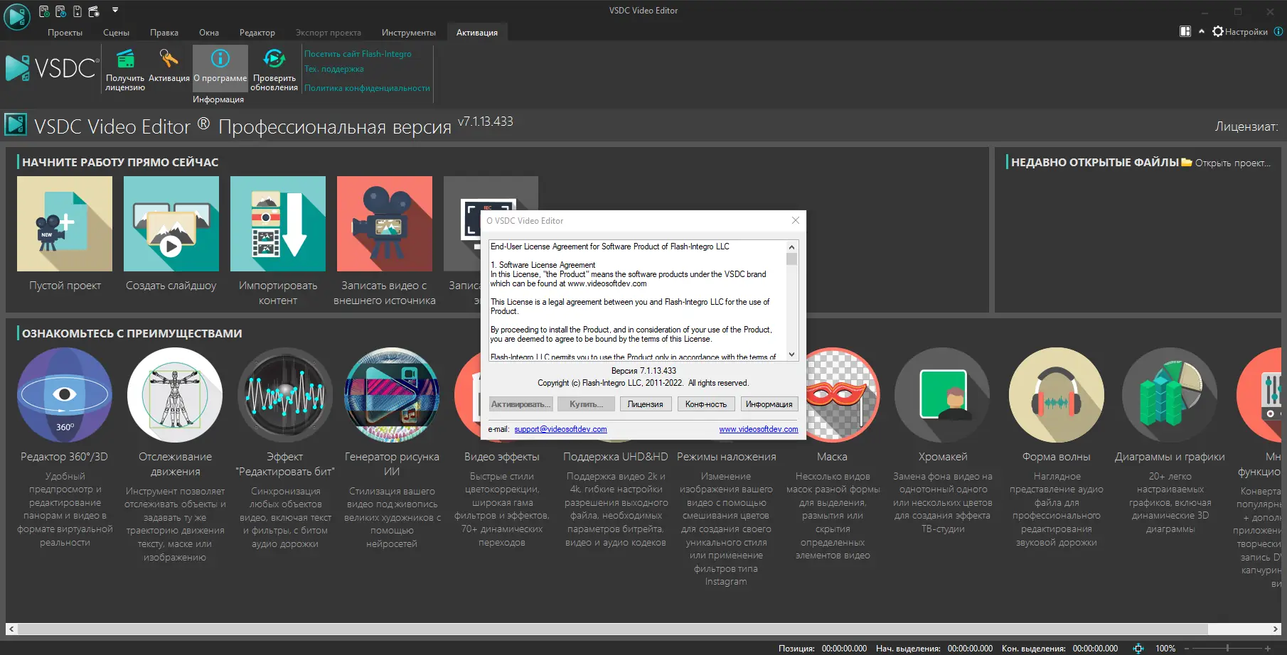 VSDC Video Editor предлагает широкий функционал при относительно небольших системных требованиях. Особенно ценна его портативная версия, которая не требует установки и не оставляет следов в системе. Это делает использование программы гибким и безопасным, особенно на чужих компьютерах. Версия pro включает дополнительные эффекты и возможности экспорта, что важно для профессиональных задач. Активация не требует сложных процедур, а интерфейс доступен на русском языке, что упрощает освоение.