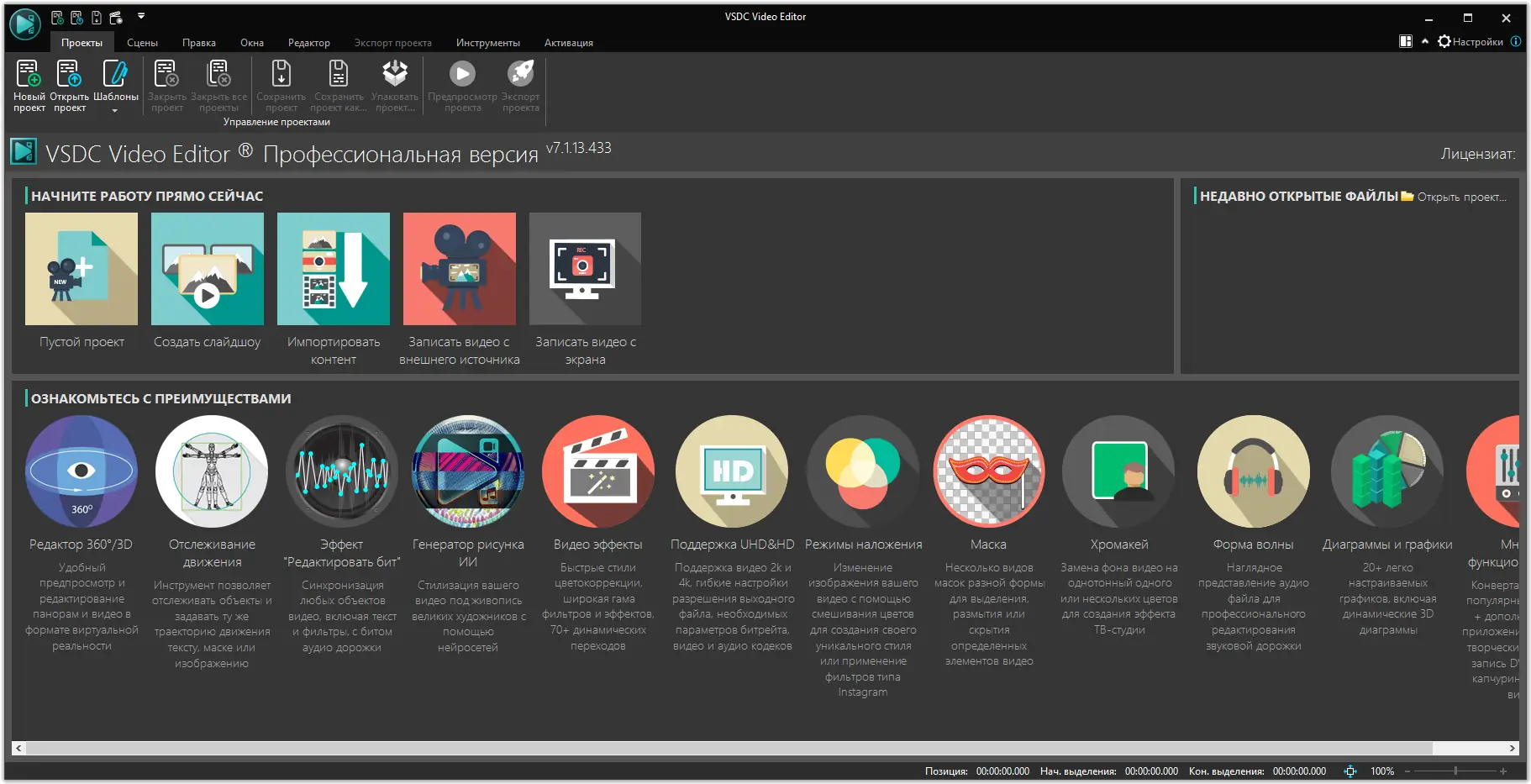 VSDC Video Editor представляет собой комплексное решение для обработки видео на компьютере. Она подходит как новичкам, так и опытным монтажерам, обеспечивая гибкость в работе благодаря нелинейному интерфейсу и широкому арсеналу инструментов. Программа позволяет импортировать медиафайлы различных типов, включая HD и 4K видео, аудиодорожки и изображения, в том числе в RAW-формате.