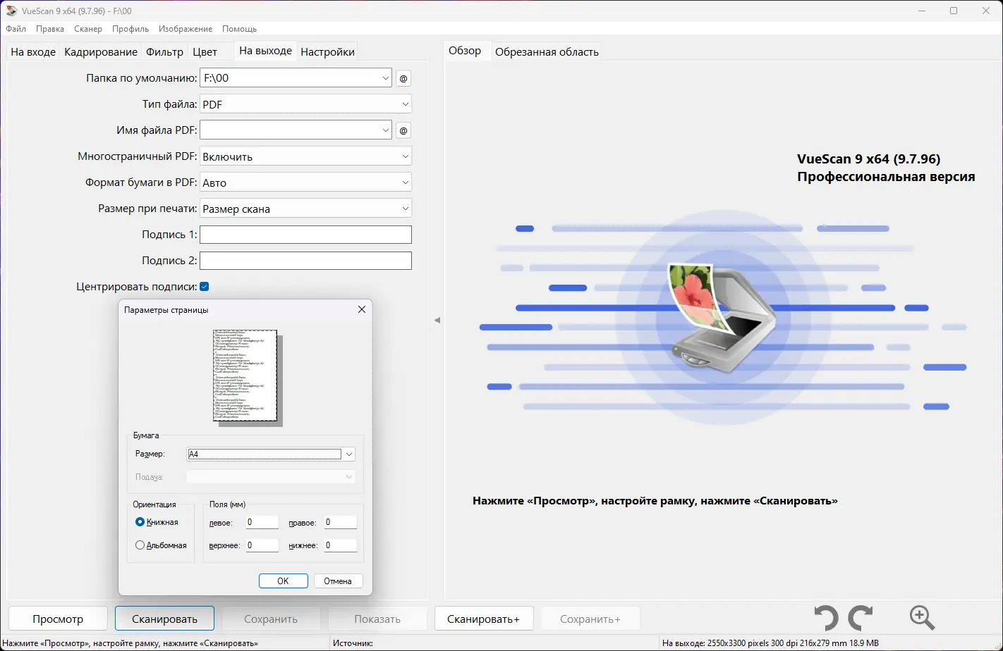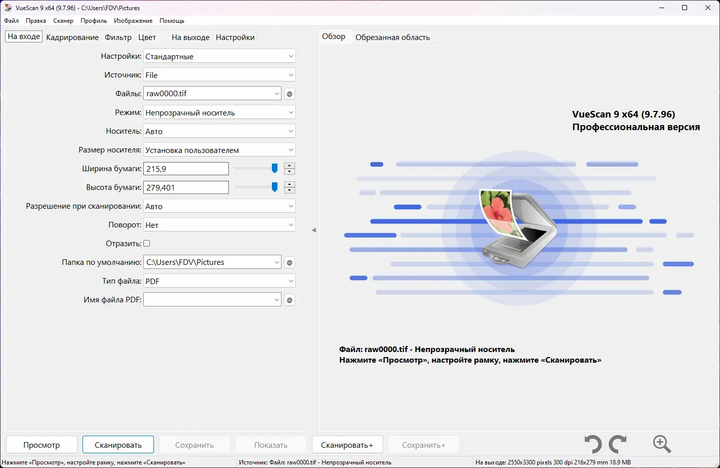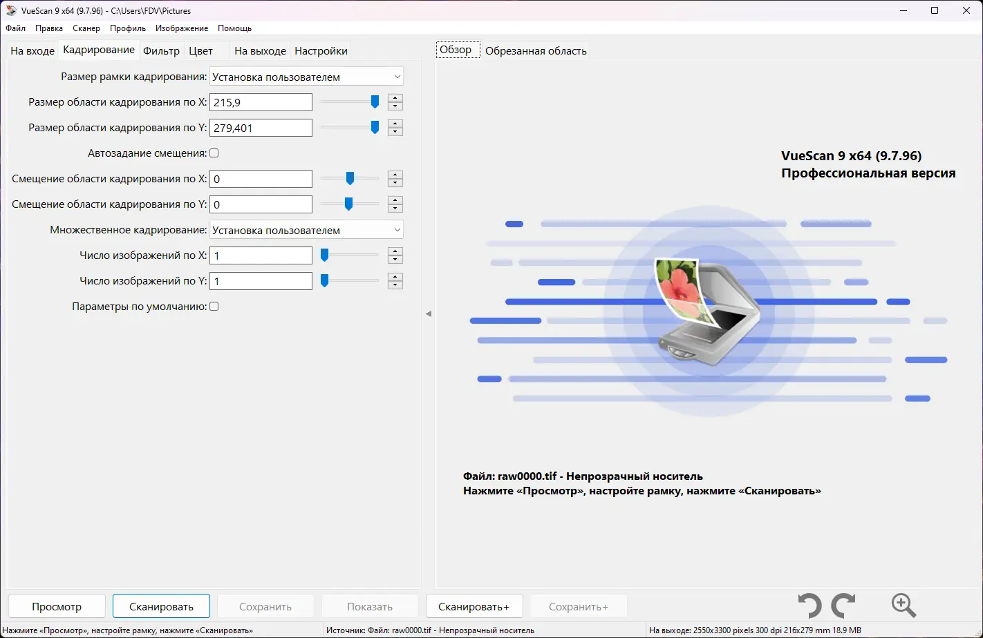 - Возможность сохранения сканирования в RAW-формате для последующей обработки без повторного запуска сканера.