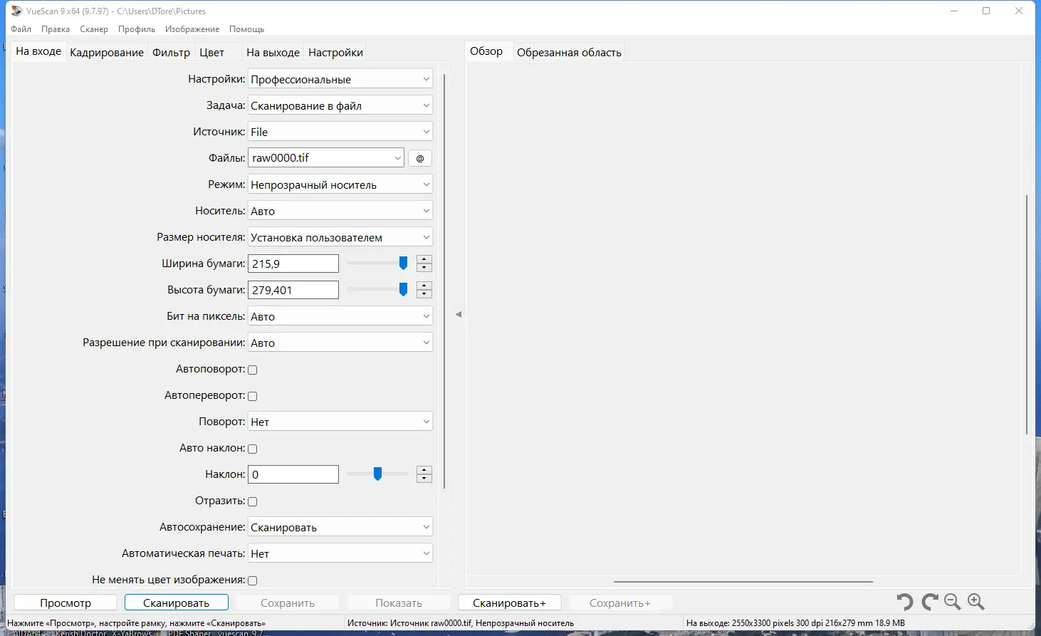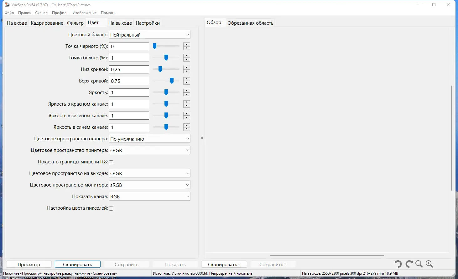 Интерфейс VueScan интуитивно понятен и разделён на логические блоки: настройки источника, цвета, экспозиции и вывода. После подключения сканера программа автоматически определяет модель и предлагает оптимальные параметры. Пользователь может выбрать тип оригинала — отражённый или прозрачный, указать разрешение, глубину цвета и формат сохранения. Для слайдов и негативов доступен выбор конкретного типа плёнки, что улучшает точность цветопередачи. Режим пакетного сканирования позволяет обработать несколько изображений подряд без участия оператора. Также можно сохранять пользовательские профили, настроенные под определённые задачи, например, архивирование негативов или подготовку изображений к печати. Все параметры поддаются ручной корректировке, включая баланс белого, градационную кривую и динамический диапазон по каждому каналу RGB.
