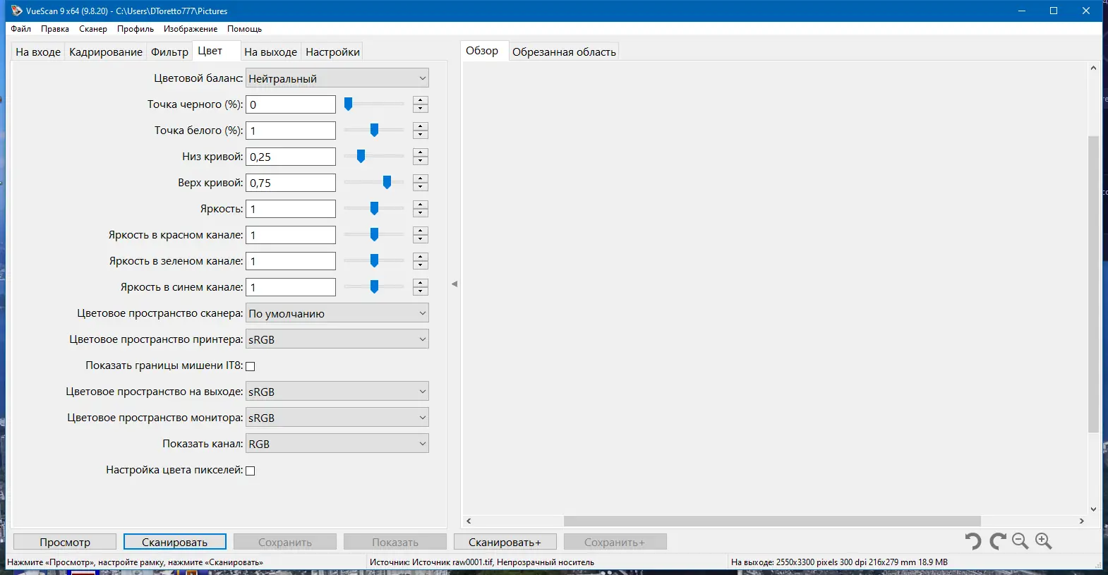 Интерфейс VueScan интуитивен и организован по принципу пошагового мастера: сначала выбирается устройство, затем тип оригинала — отражённый, негатив или слайд. Далее задаются параметры разрешения, цветовой режим, битность и формат сохранения — TIFF, JPEG, PNG или 48-битный RAW. Перед сканированием можно загрузить пользовательский профиль, включающий настройки цветокоррекции, экспозиции и фильтров. Для пакетной обработки активируется режим batch, позволяющий сканировать несколько документов подряд с автоматическим сохранением.
