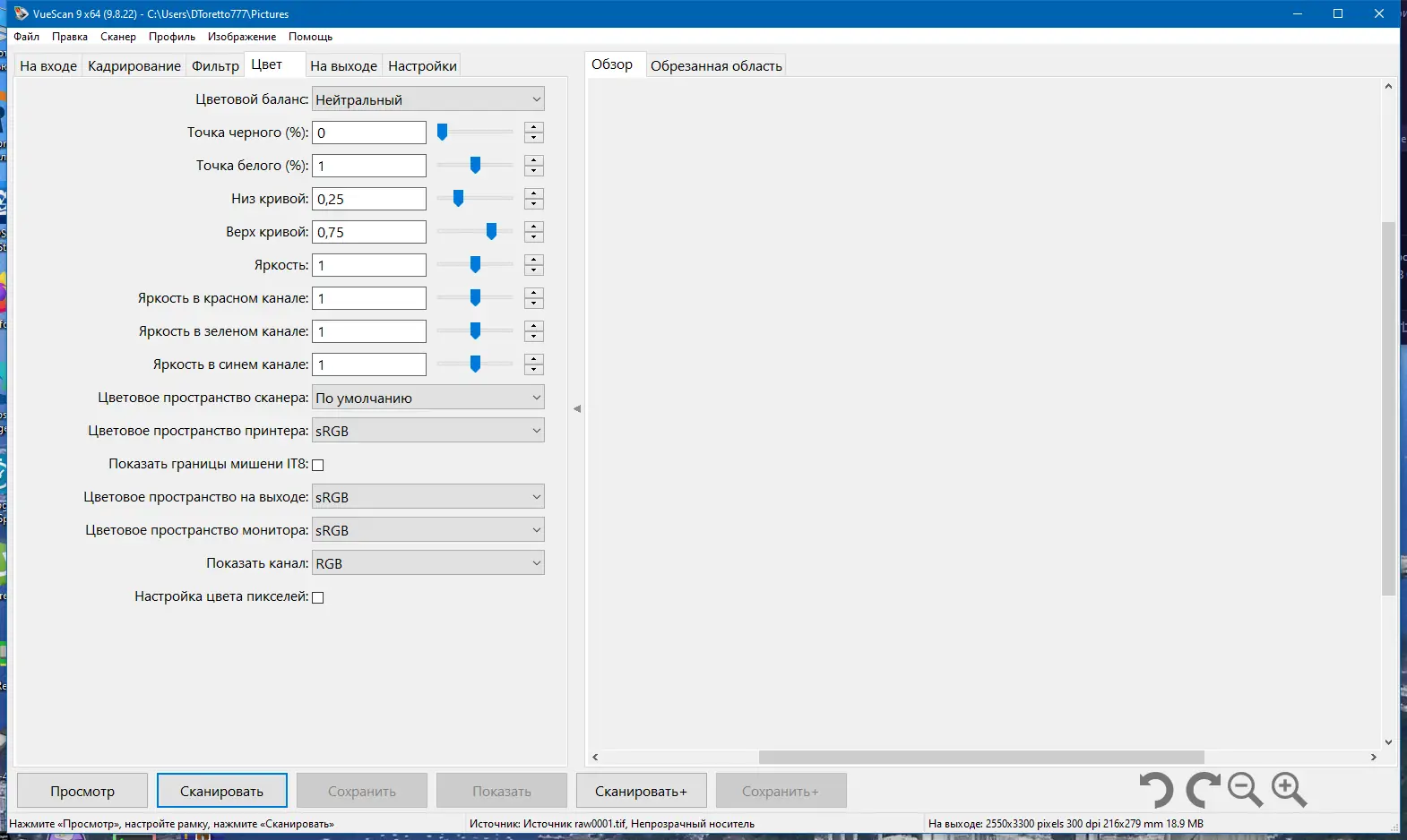 Интерфейс VueScan интуитивно понятен, несмотря на обилие технических настроек. После подключения сканера программа автоматически распознаёт устройство и предлагает оптимальные параметры сканирования. Пользователь может выбрать тип оригинала — отражённый или прозрачный, задать разрешение, формат выходного файла и режим цветности. Для профессиональной обработки доступны ручные регулировки уровней теней, светов и гаммы по каждому цветовому каналу.
