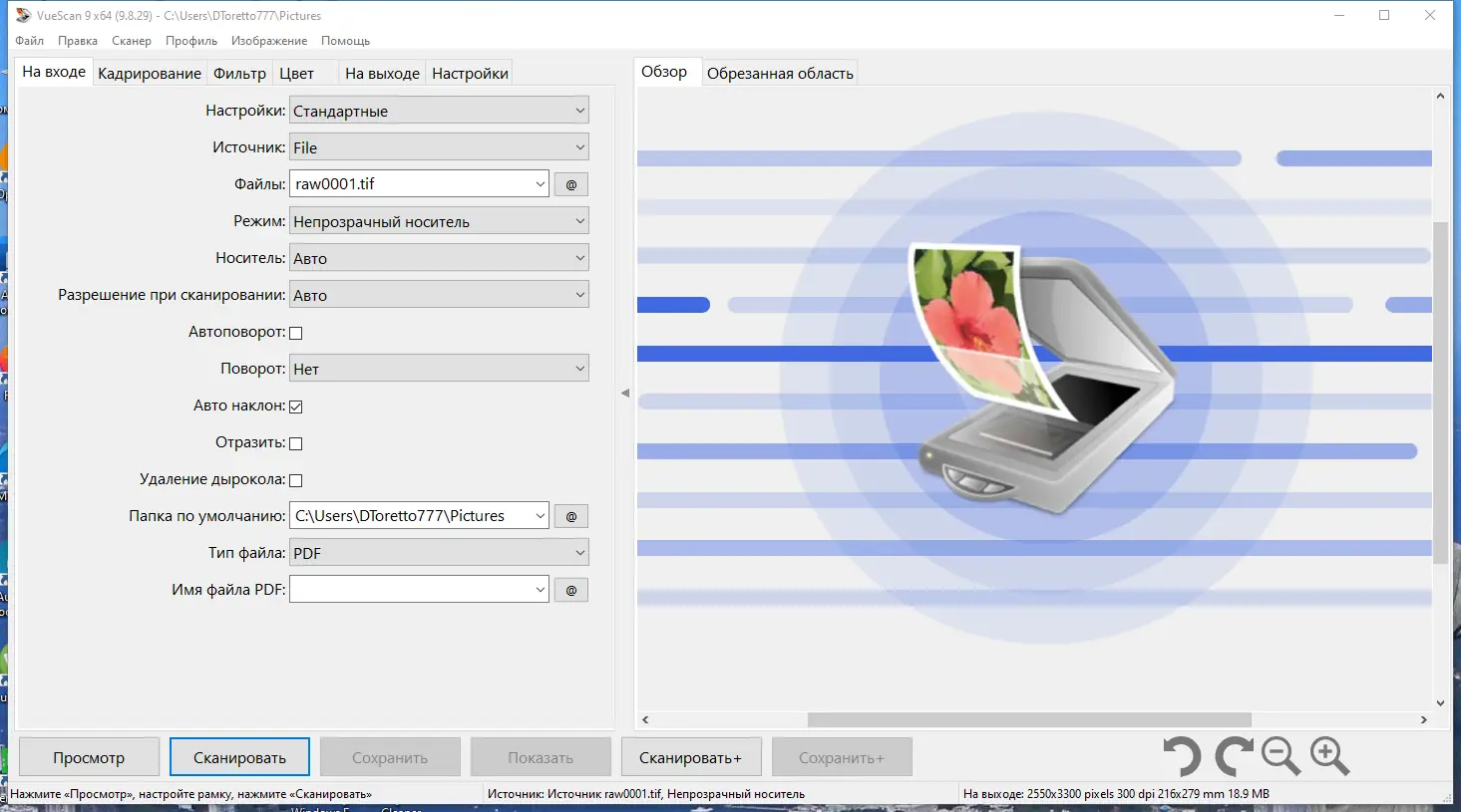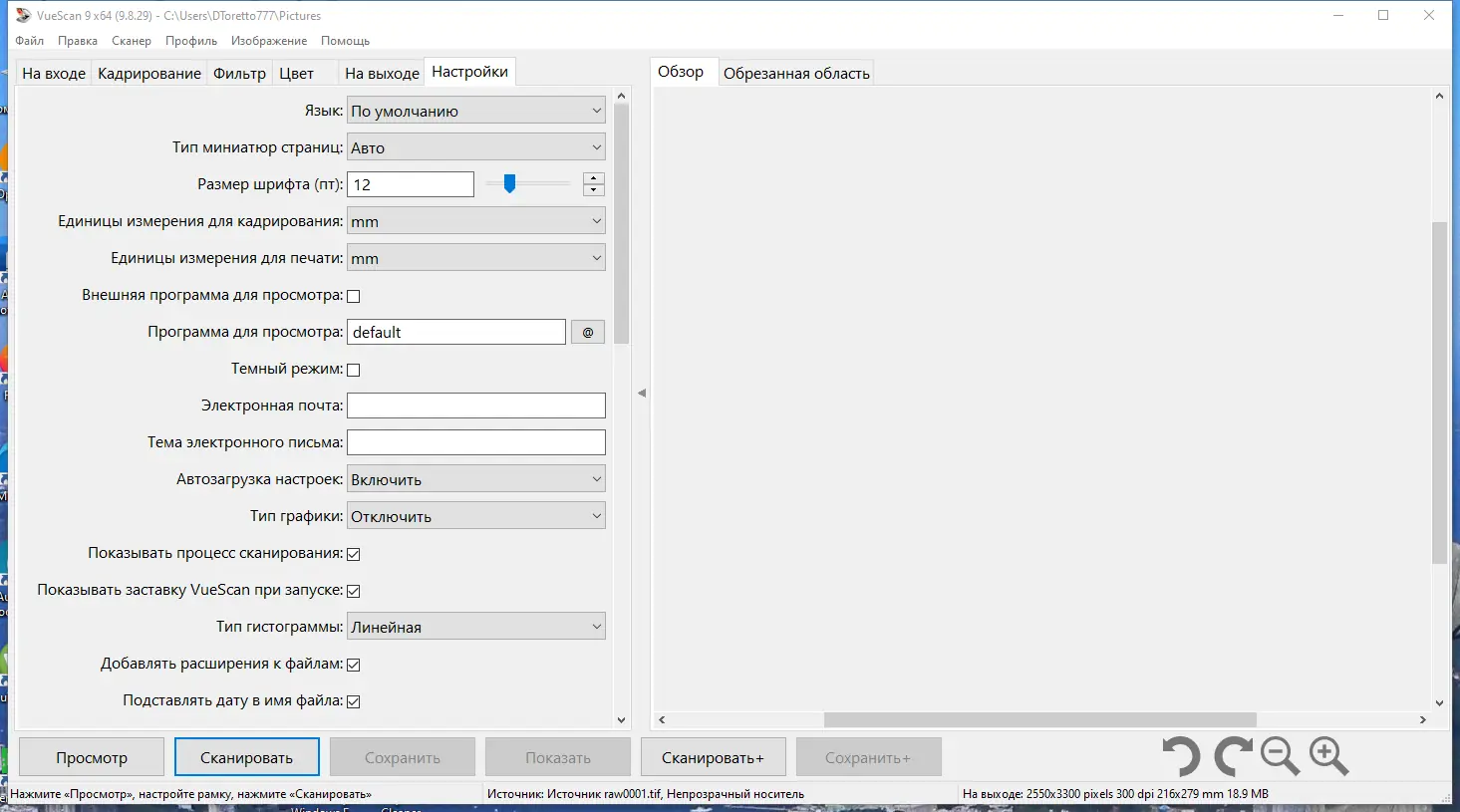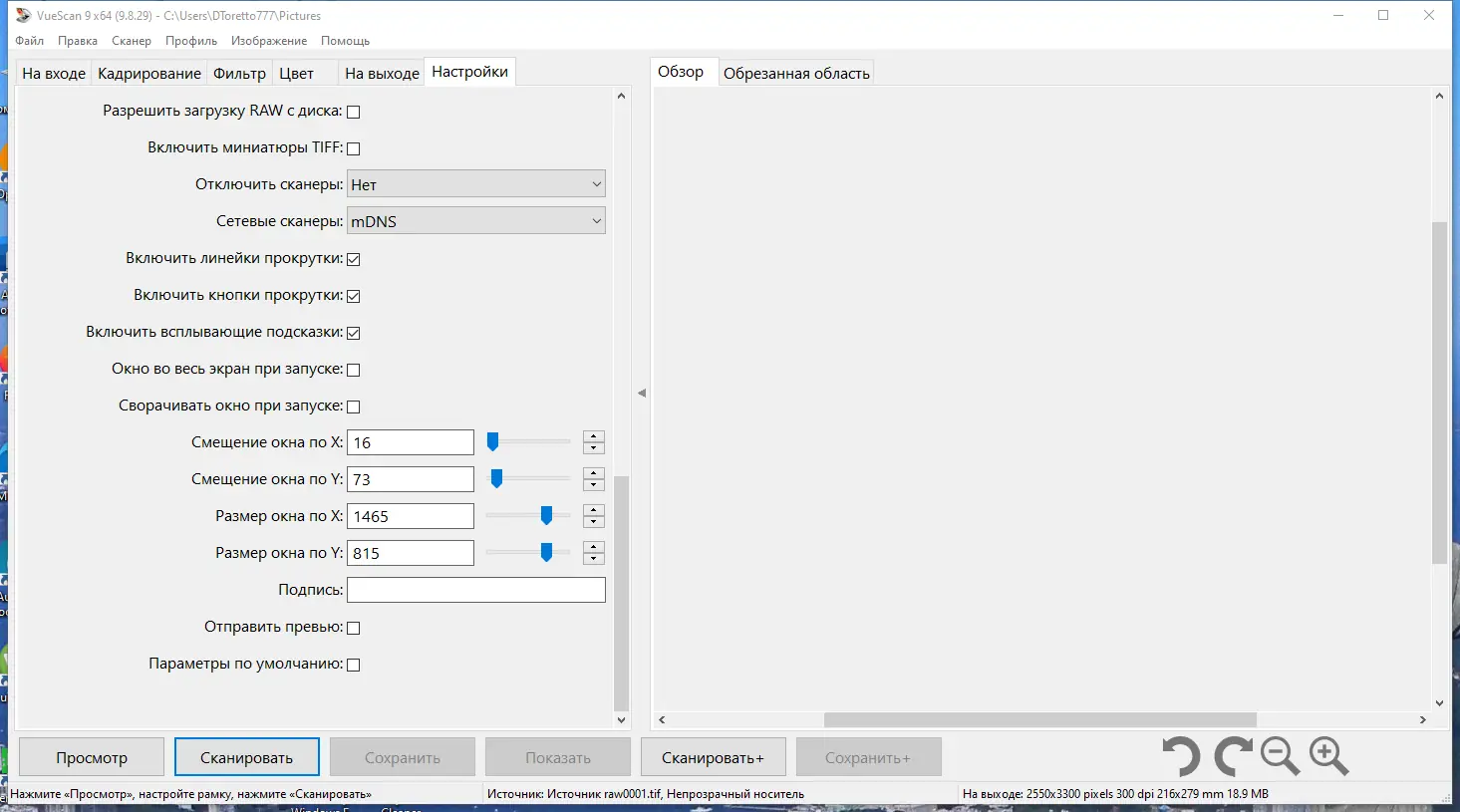 - Позволяет сохранять сканированные изображения в RAW-формате, что сохраняет исходные данные без потерь и даёт возможность последующей обработки вне зависимости от состояния сканера.