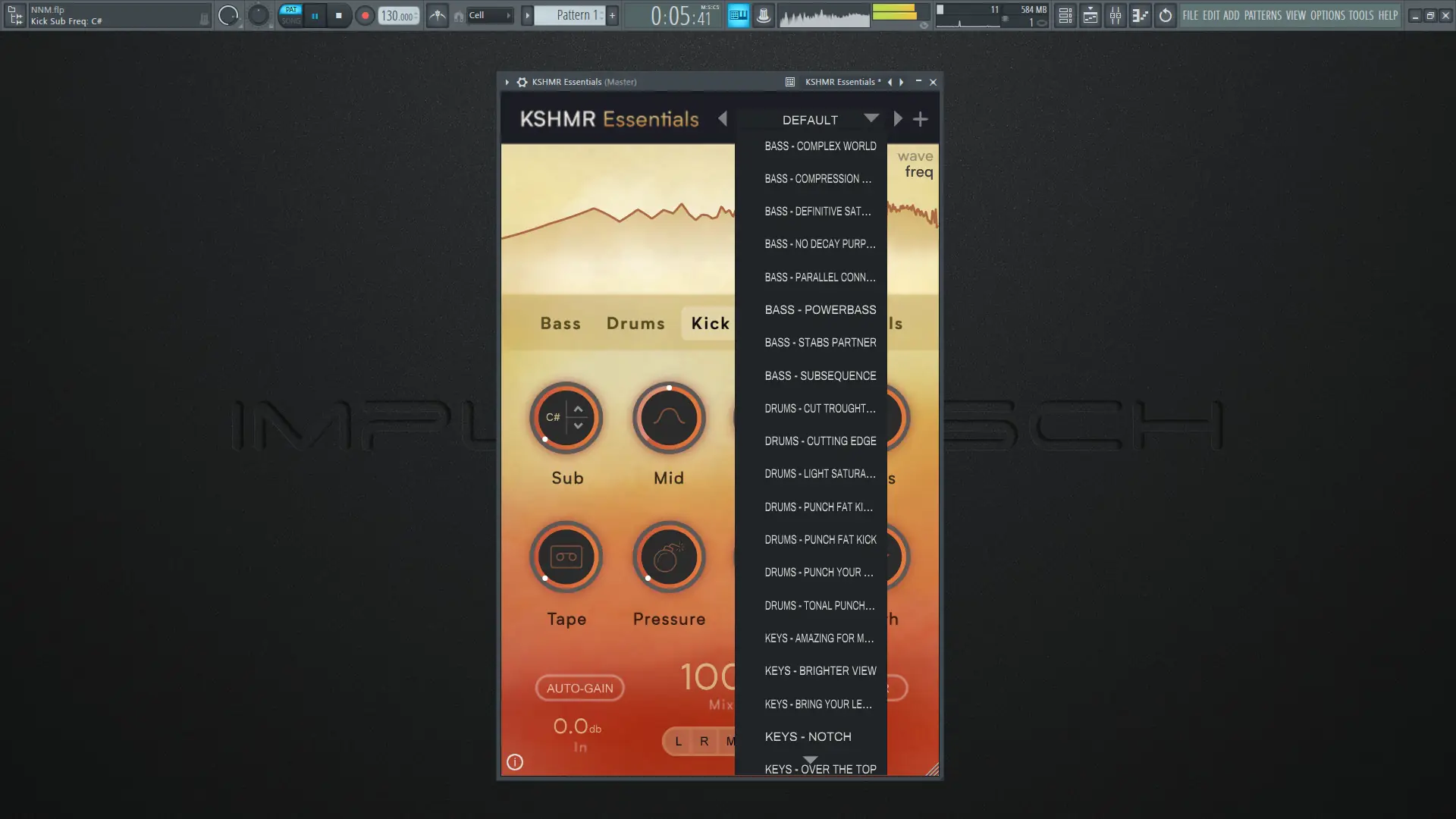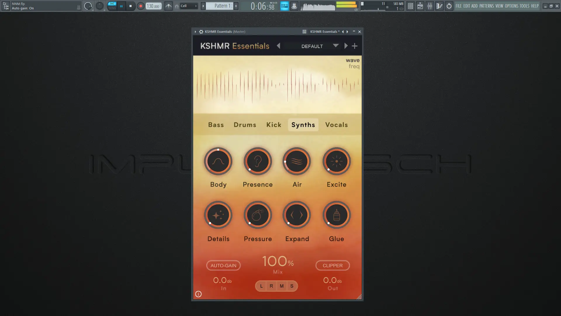 Использование плагина начинается с выбора нужного модуля — Bass, Drums, Kick, Synths или Vocals. После загрузки в DAW пользователь может сразу применить один из встроенных пресетов, чтобы оценить звучание, или начать с нуля, регулируя единый дайал. Каждое изменение отображается в реальном времени на визуализаторе, где можно переключаться между волной и частотным спектром. Режимы мониторинга позволяют прослушивать центр, стороны, левый и правый каналы отдельно. Благодаря функциям Auto-Gain и Clipper, выходной уровень автоматически корректируется, что исключает скачки громкости при сравнении состояний «до» и «после».