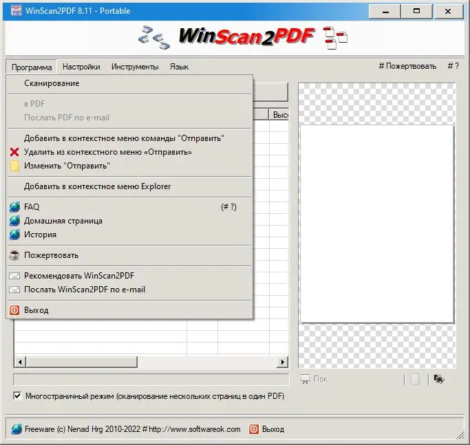 WinScan2PDF — это компактное настольное приложение для Windows, позволяющее быстро сканировать документы и сохранять их в формате PDF без необходимости использовать драйверы виртуальных принтеров. Программа предназначена как для частного, так и для офисного использования, обеспечивая простоту и эффективность при работе с бумажными документами. Процесс сканирование становится прямым и интуитивно понятным, а результат — готовый PDF-файл, пригодный для отправки по электронной почте или архивирования.