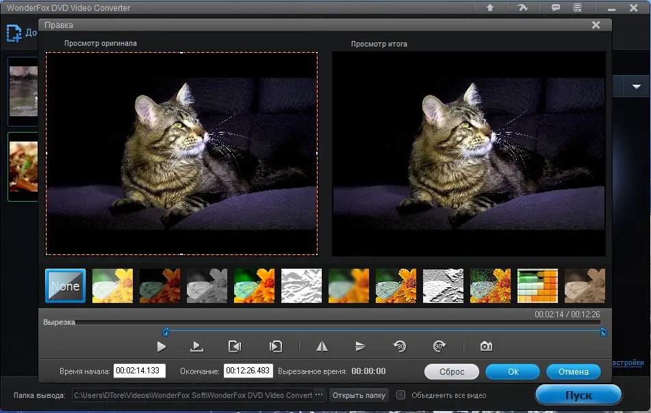 - Встроенный редактор для обрезки, объединения, поворота кадров и настройки громкости