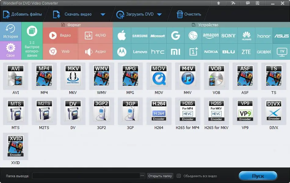 - Конвертер работает с более чем 300 форматами, включая AVI, MKV, MP4, MOV, FLV, WMV и другие