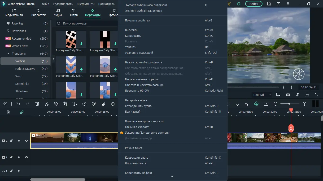 - Наличие множества шаблонов, эффектов и инструментов автоматизации, включая Instant Mode и Speed Ramping.