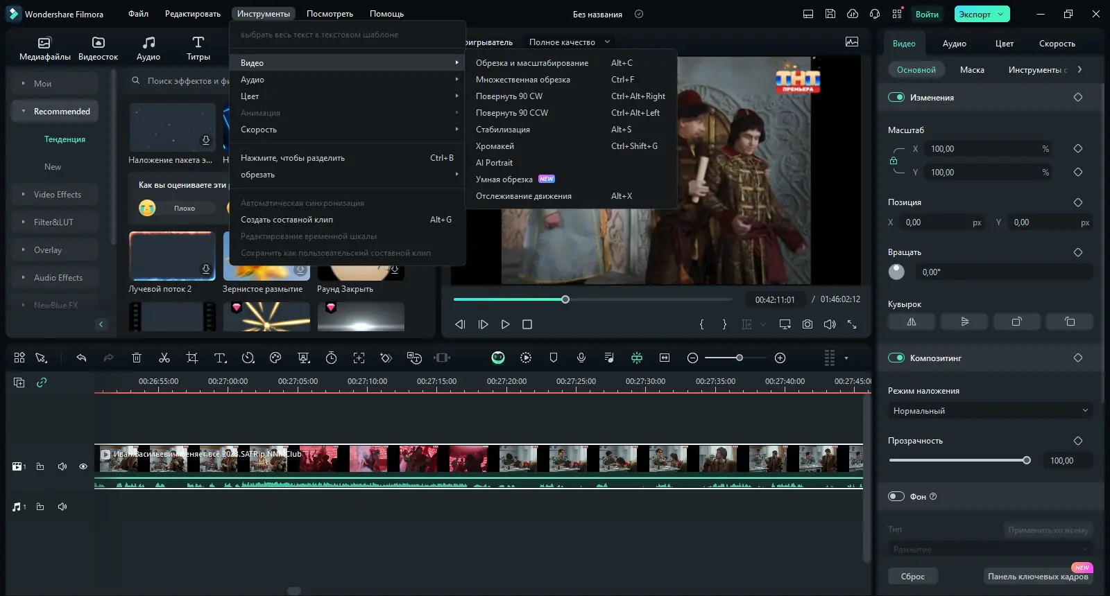 - Инструменты обрезки, поворота, изменения скорости и наложения переходов позволяют тонко настраивать каждый фрагмент.