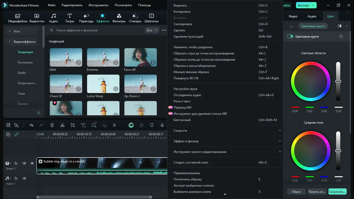 Программа активно использует технологии искусственного интеллекта, что упрощает такие задачи, как отслеживание объектов, выделение портретов и автоматическая цветокоррекция.