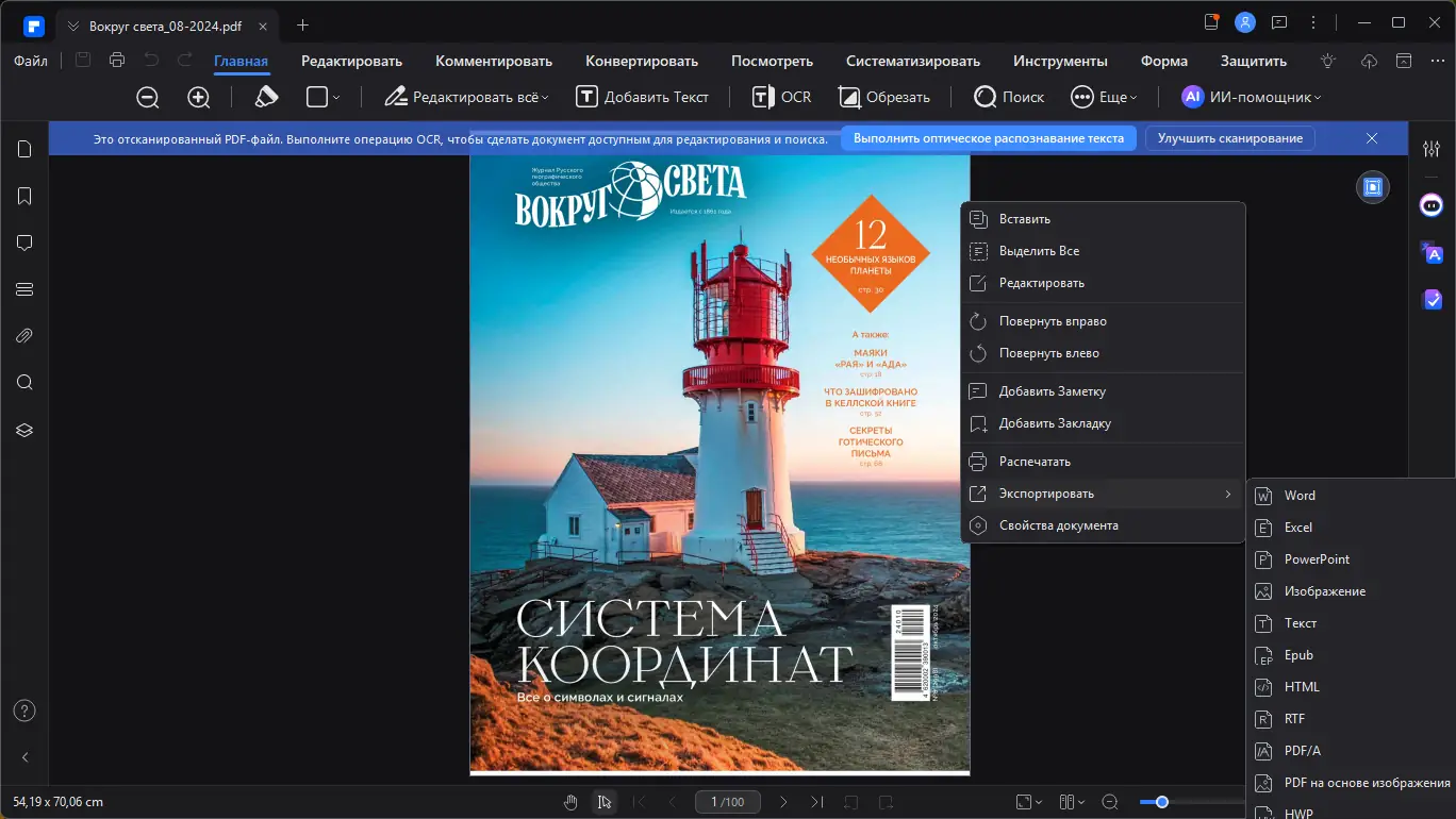 - Поддержка технологии OCR для преобразования сканированных документов в редактируемые файлы с распознаванием текста на русском, английском, немецком, испанском и других языках.