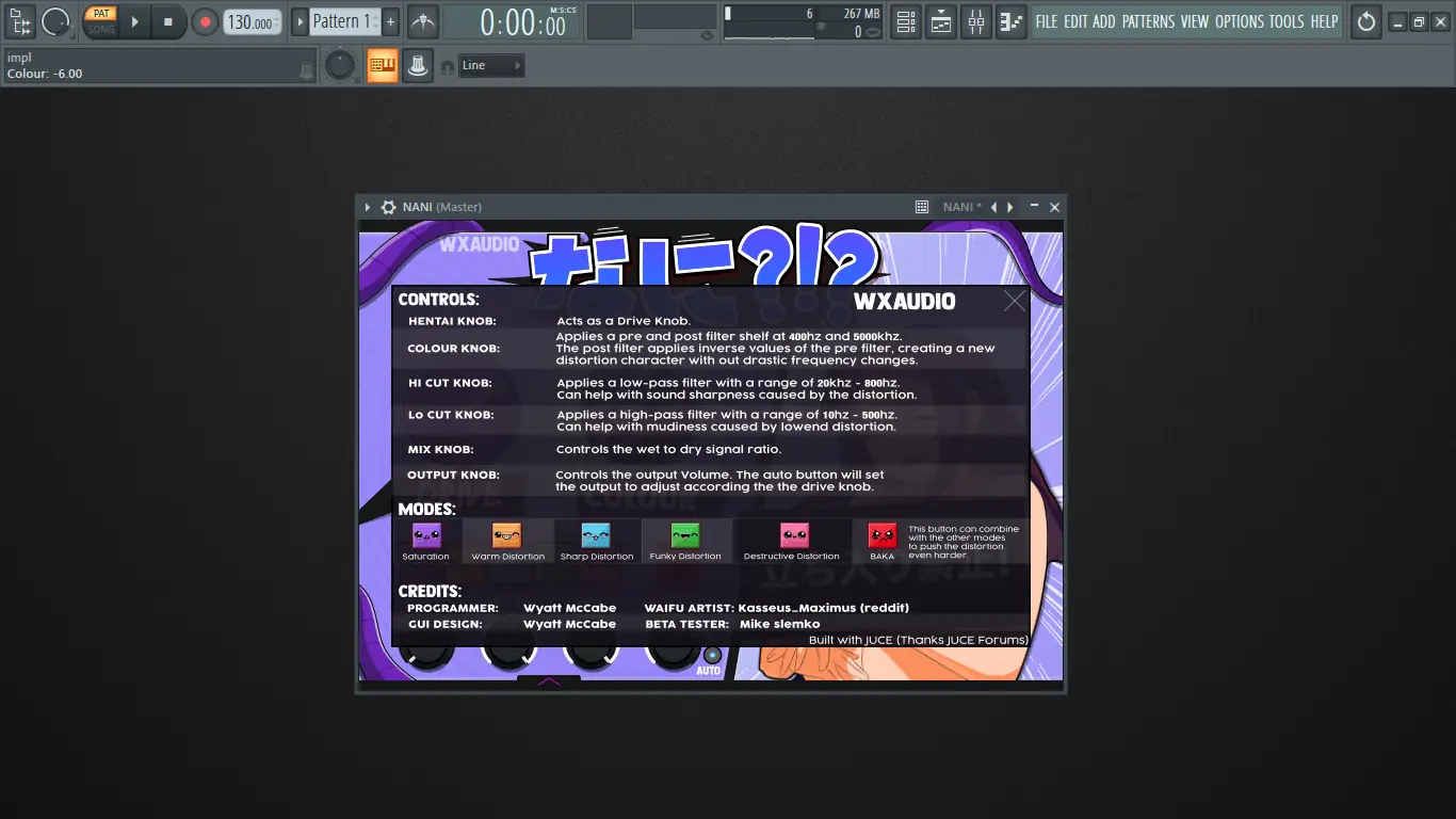 WXAudio представляет собой аудиоплагин формата VST, предназначенный для обработки звуковых сигналов в цифровых аудиостанциях. Основной акцент сделан на эффекты дисторшна, позволяющие трансформировать исходный звук любым желаемым способом. Интерфейс программы оформлен в ярком аниме-стиле, что выделяет её на фоне стандартных аудиоинструментов. Визуальная составляющая не мешает функционалу, а напротив, делает процесс работы более вовлекающим. Каждый элемент управления интуитивно понятен, а анимированные переходы добавляют ощущение живого взаимодействия с инструментом.