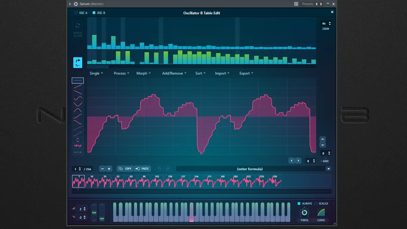 Интерфейс Serum построен вокруг визуального редактирования. Осциллограмма отображает текущую форму волны, которую можно редактировать вручную — рисовать, импортировать из аудиофайлов или генерировать с помощью БПФ. Перетаскивание LFO или Envelope на параметр фильтра или эффекта мгновенно создаёт связь в матрице модуляции. Режимы Unison позволяют комбинировать до 16 голосов с индивидуальными настройками искажения и позиции в волновой таблице. Эффекты можно переупорядочивать, а их параметры — модулировать, что открывает широкие возможности для динамичных патчей. Режимы Remap позволяют рисовать собственные кривые манипуляций с таблицей, добавляя креативности в процесс.