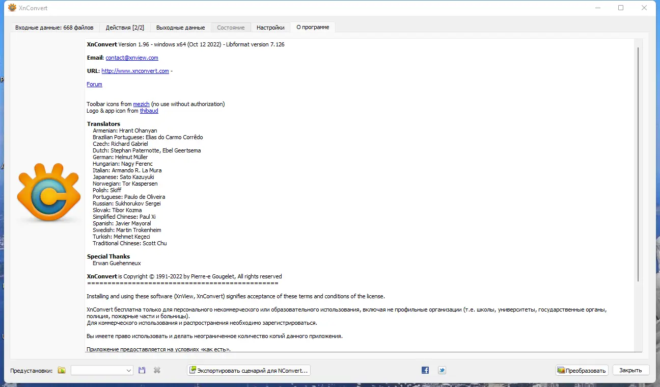XnConvert — это мощный инструмент для массовой обработки и конвертации изображений, поддерживающий более 500 графических форматов. Программа совместима с различными операционными системами и предлагает широкий набор функций: от изменения размера и поворота до наложения фильтров, редактирования метаданных и применения водяных знаков. Благодаря интуитивному интерфейсу и поддержке пакетной обработки, XnConvert подходит как для новичков, так и для профессионалов в области цифровой графики.
