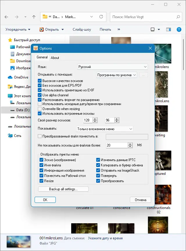 - Отображение эскизов изображений прямо в контекстном меню с возможностью настройки размера и качества превью