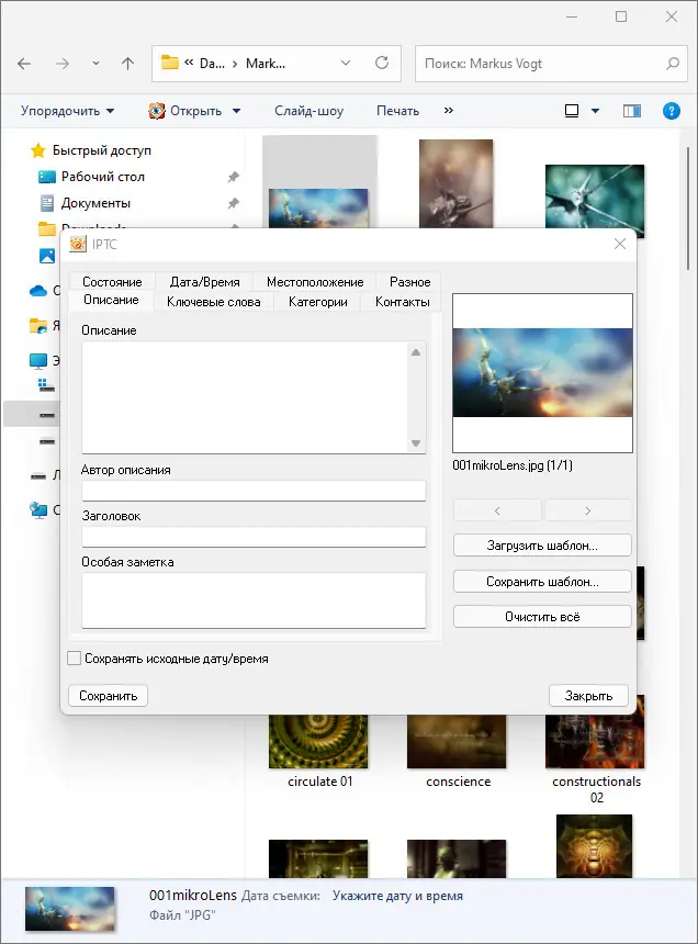 - Просмотр технической информации: разрешение, глубина цвета, размер файла и формат