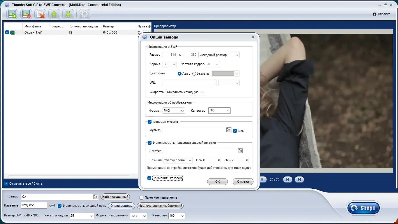 - Преобразование в SWF с регулировкой версии Flash, цвета фона, добавлением музыки и управлением скоростью воспроизведения.