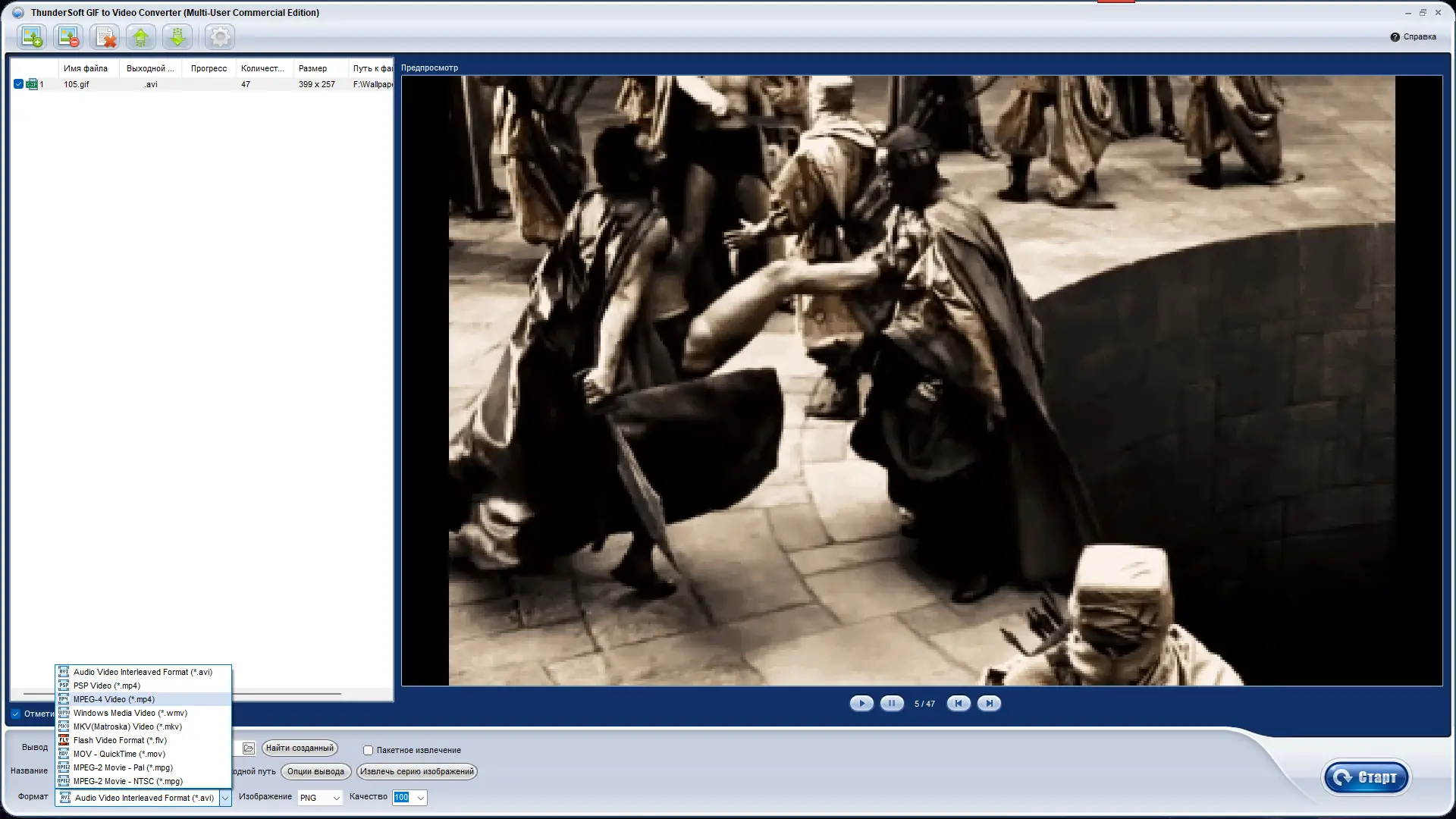 - Преобразует GIF, PNG, BMP и JPEG в видео с поддержкой множества форматов, включая MP4, AVI, MKV, FLV, MOV и MPEG.