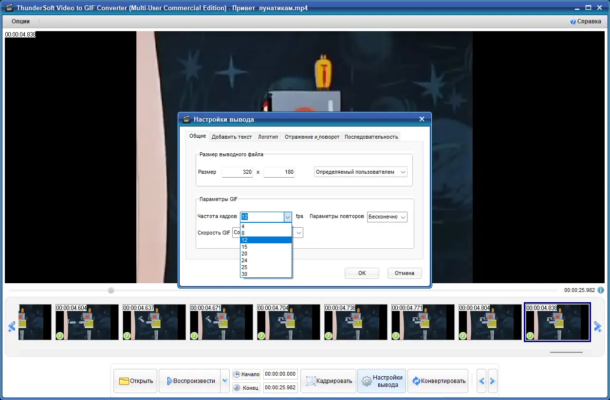 - Доступна настройка скорости воспроизведения итогового GIF, а также количество повторов анимации.