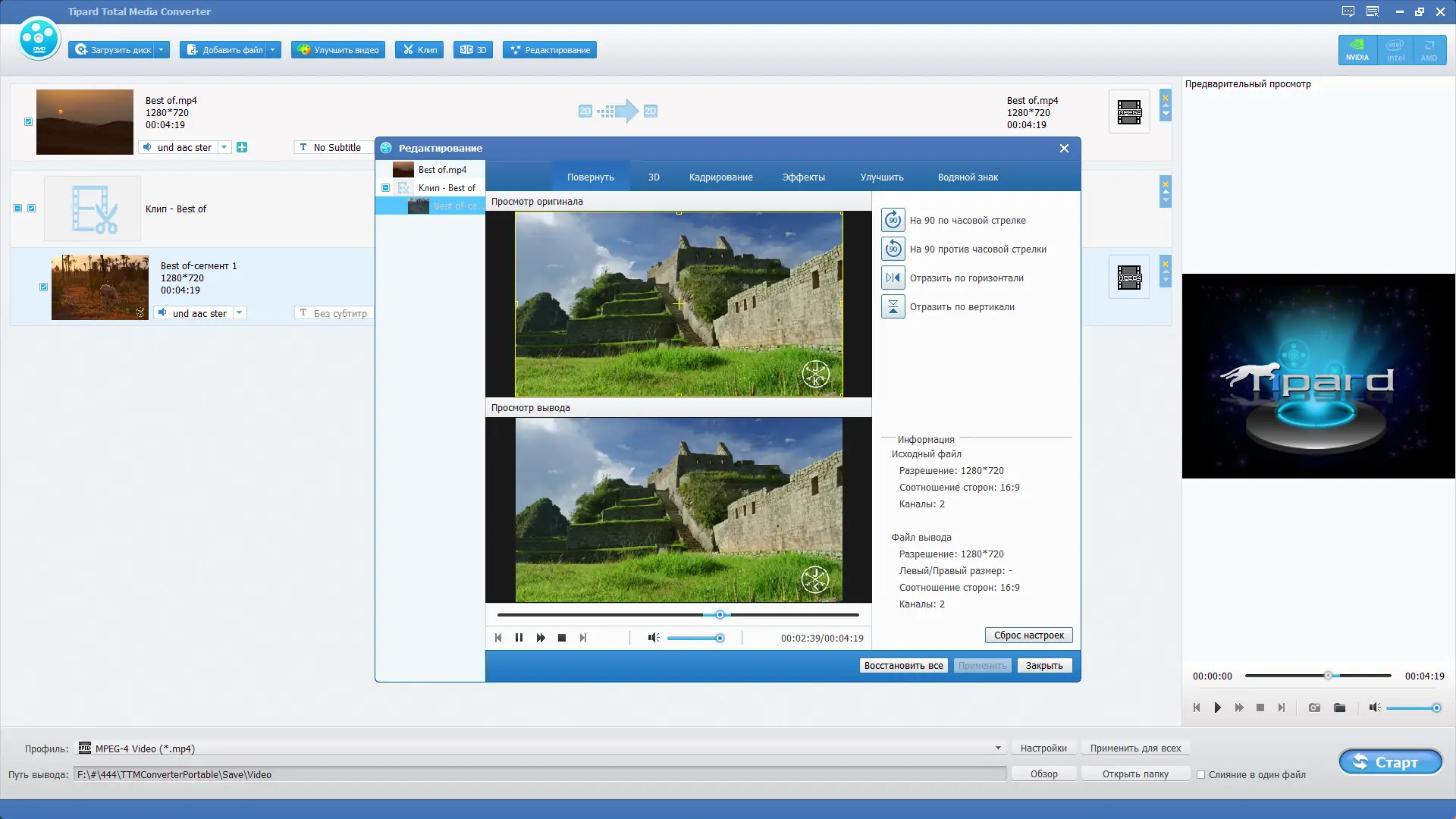 Tipard Total Media Converter представляет собой многофункциональное приложение, предназначенное для преобразования медиафайлов в нужные форматы без потери качества. Оно работает как с отдельными файлами, так и с DVD-дисками, включая образы и папки с контентом. Программа поддерживает пакетную обработку, что позволяет одновременно конвертировать множество видео или аудиозаписей, задавая индивидуальные параметры для каждого элемента.
