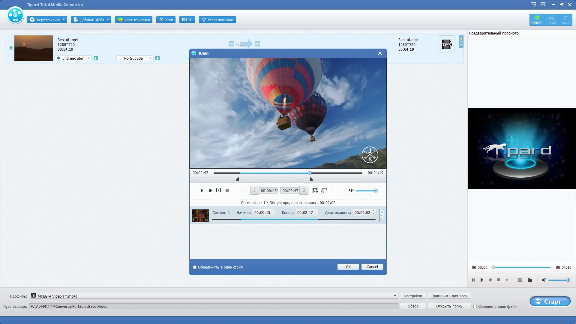 Tipard Total Media Converter — универсальный инструмент для конвертации видео и аудио из одного формата в другой с высоким качеством и минимальными временными затратами. Программа поддерживает широкий спектр входных и выходных форматов, включая DVD, HD-видео и популярные аудиокодеки, а также позволяет извлекать звуковые дорожки и оптимизировать контент под различные устройства.