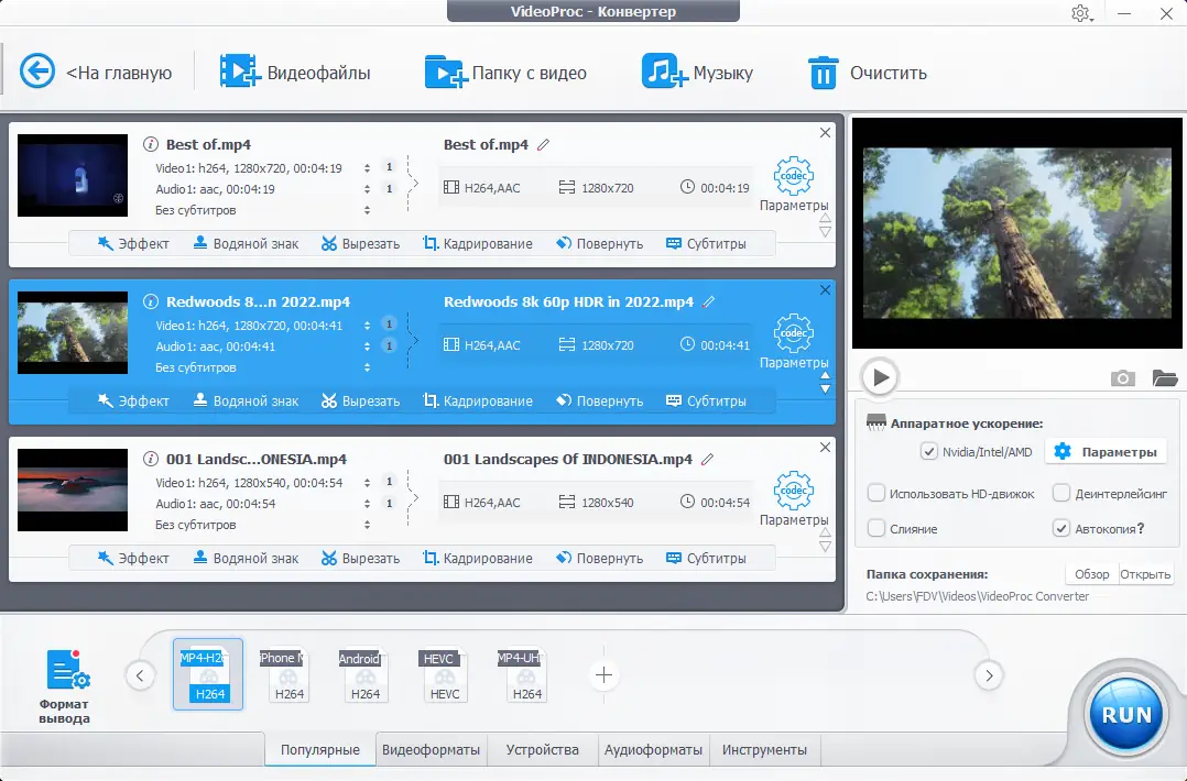 - Широкий выбор форматов и гибкие настройки конвертации, включая поддержку 4K и HDR.