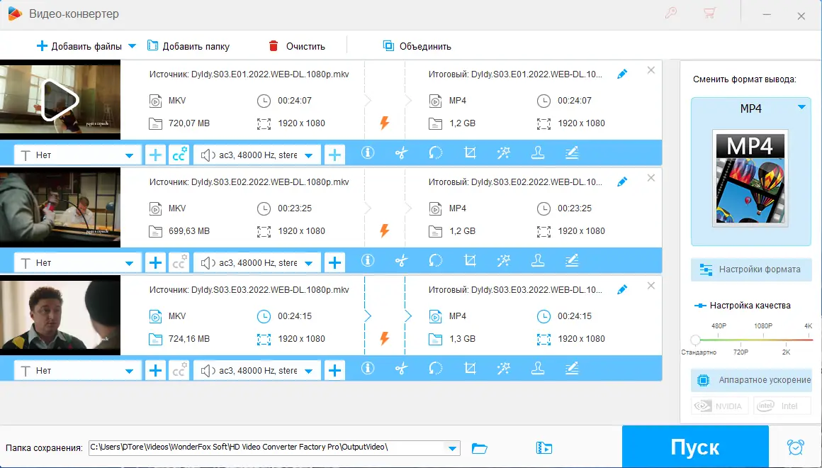 WonderFox HD Video Converter Factory сочетает в себе мощные функции конвертера, видеоредактора и компрессора. Программа легко справляется с преобразованием видео из стандартного разрешения в HD, обеспечивая качественный результат без потерь. Поддержка современных кодеков H265 (HEVC) и VP9 позволяет оптимизировать видео для эффективного хранения и трансляции. Кроме того, инструмент поддерживает режим реального времени, что ускоряет процесс конвертации даже при работе с большими файлами.