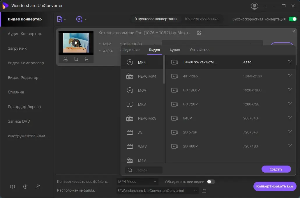Wondershare UniConverter — это универсальное решение для конвертации и обработки видео в более чем 159 форматах с поддержкой 4K и 8K. Программа обеспечивает высокую скорость преобразования, встроенные инструменты редактирования, запись дисков и загрузку контента из онлайн-источников. Благодаря интуитивному интерфейсу и широкому функционалу, она подходит как новичкам, так и профессионалам.