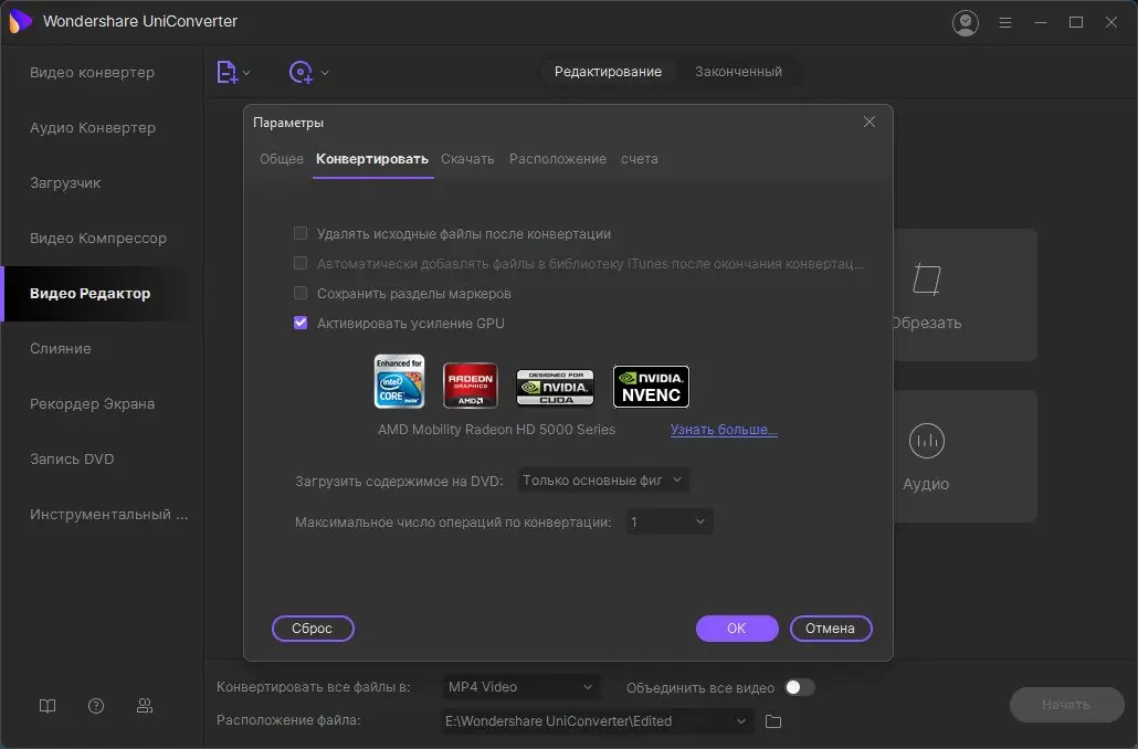 - Конвертация видео в более чем 1000 форматов с 30-кратным ускорением за счёт аппаратного кодирования.