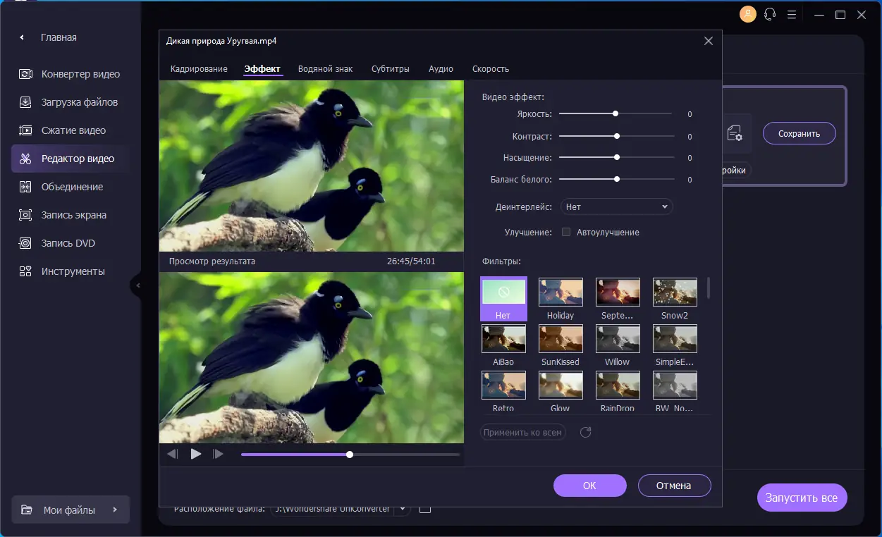 Wondershare UniConverter — универсальный видеоконвертер с расширенными функциями редактирования, позволяющий работать с более чем 159 форматами. Программа поддерживает конвертацию, редактирование, загрузку и запись видео, включая форматы 4K и HEVC/H.265, а также предлагает инструменты для удаления шумов, наложения водяных знаков и преобразования 2D в 3D. Благодаря аппаратному ускорению конвертация проходит в 30 раз быстрее без потери качества изображения.