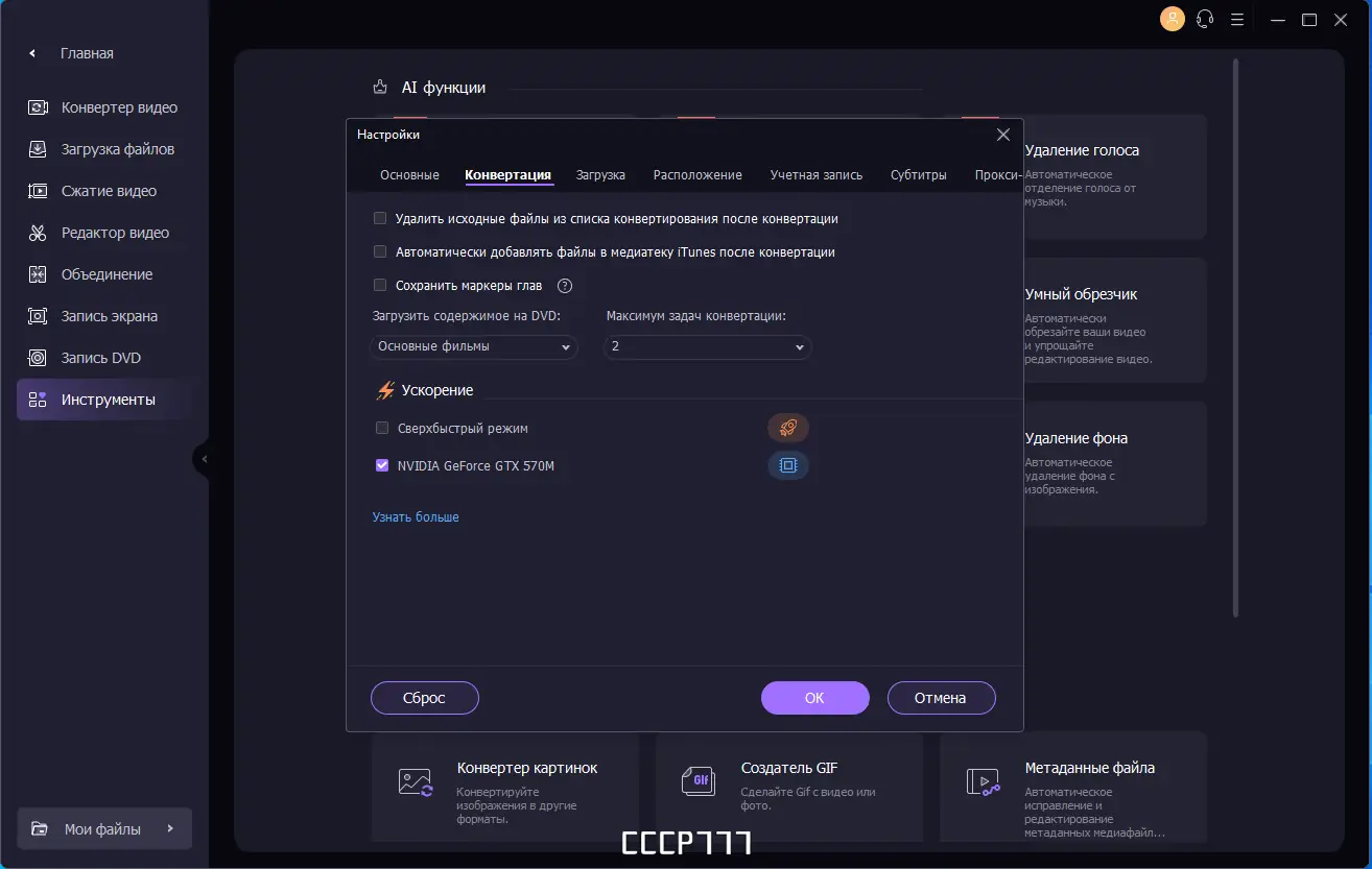 - Высокая скорость конвертации благодаря поддержке GPU и многопоточности