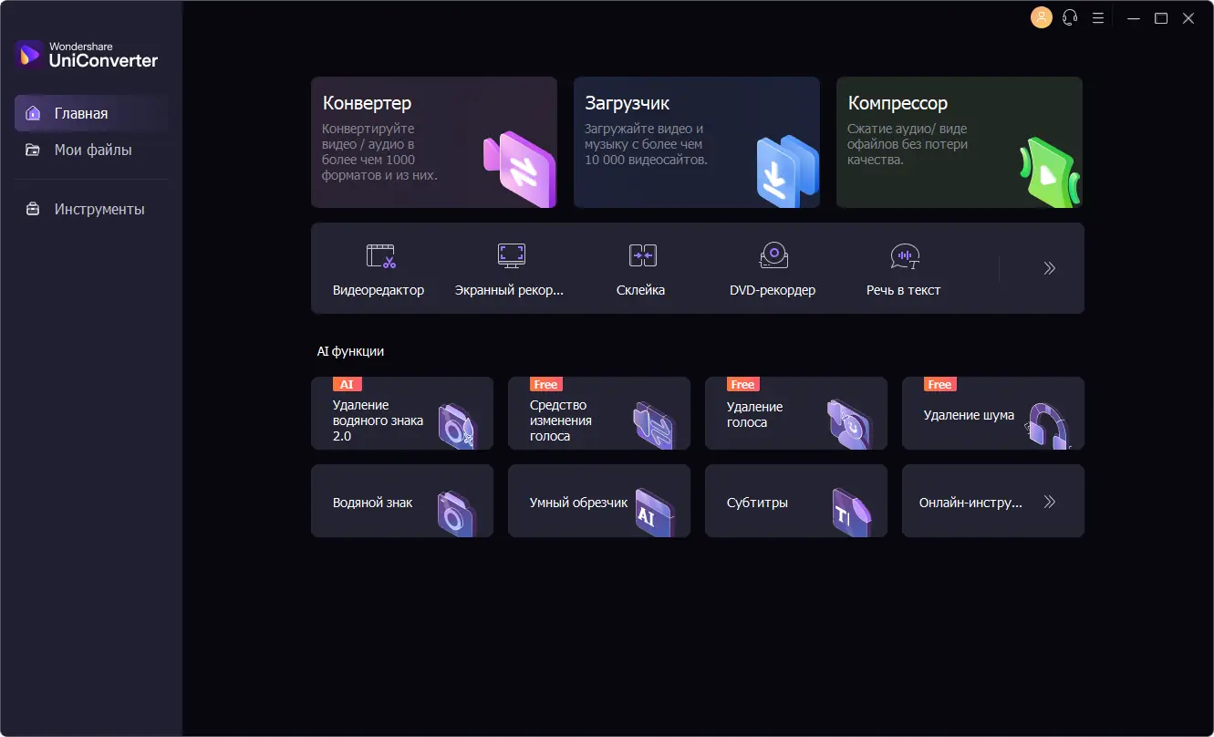 Wondershare UniConverter — универсальный видеоредактор и конвертер, поддерживающий более 159 форматов. Программа позволяет быстро конвертировать, редактировать, записывать и скачивать видео, включая контент в разрешении 4K. Благодаря интуитивному интерфейсу и широкому набору инструментов, она подходит как для новичков, так и для опытных пользователей. Работа с медиафайлами становится проще благодаря встроенным функциям редактирования, передачи по Wi-Fi и конвертации с аппаратным ускорением.