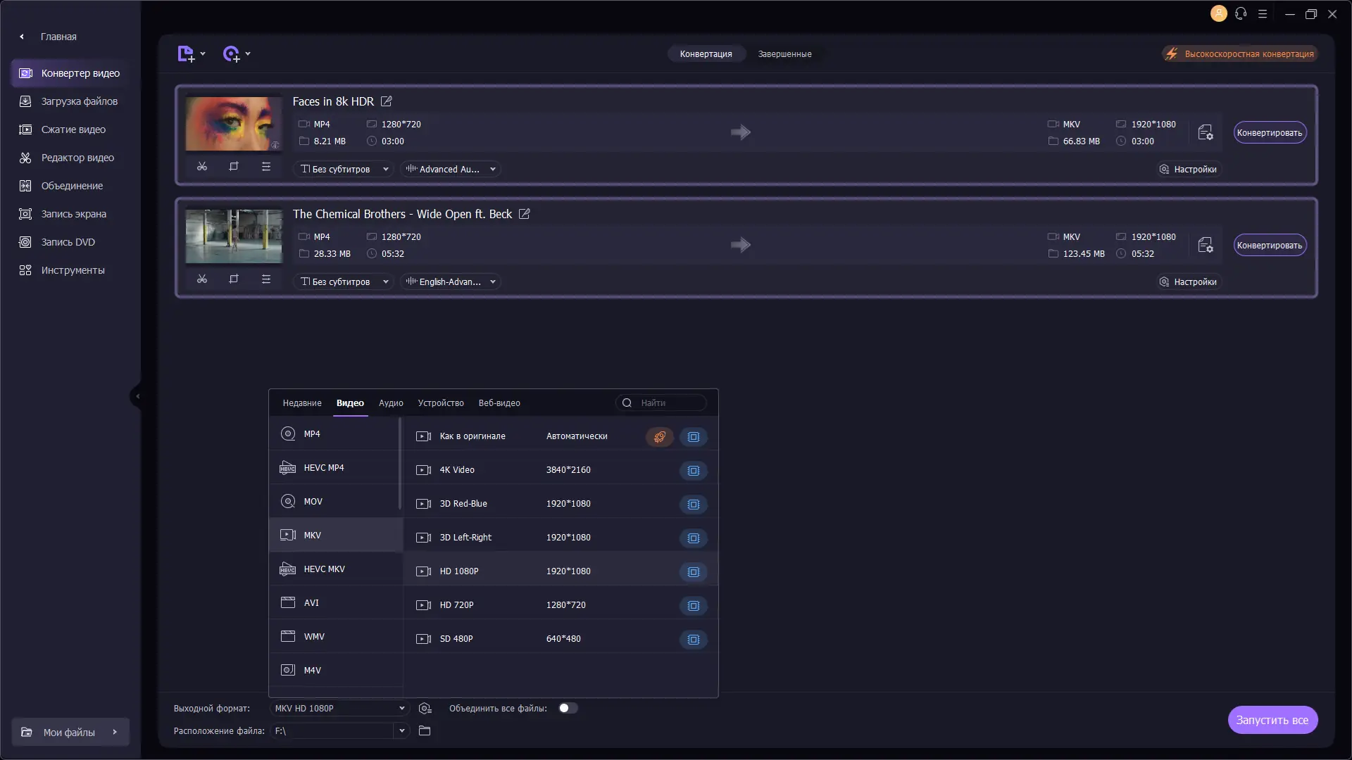 - Конвертация с 30-кратным ускорением за счёт GPU-обработки