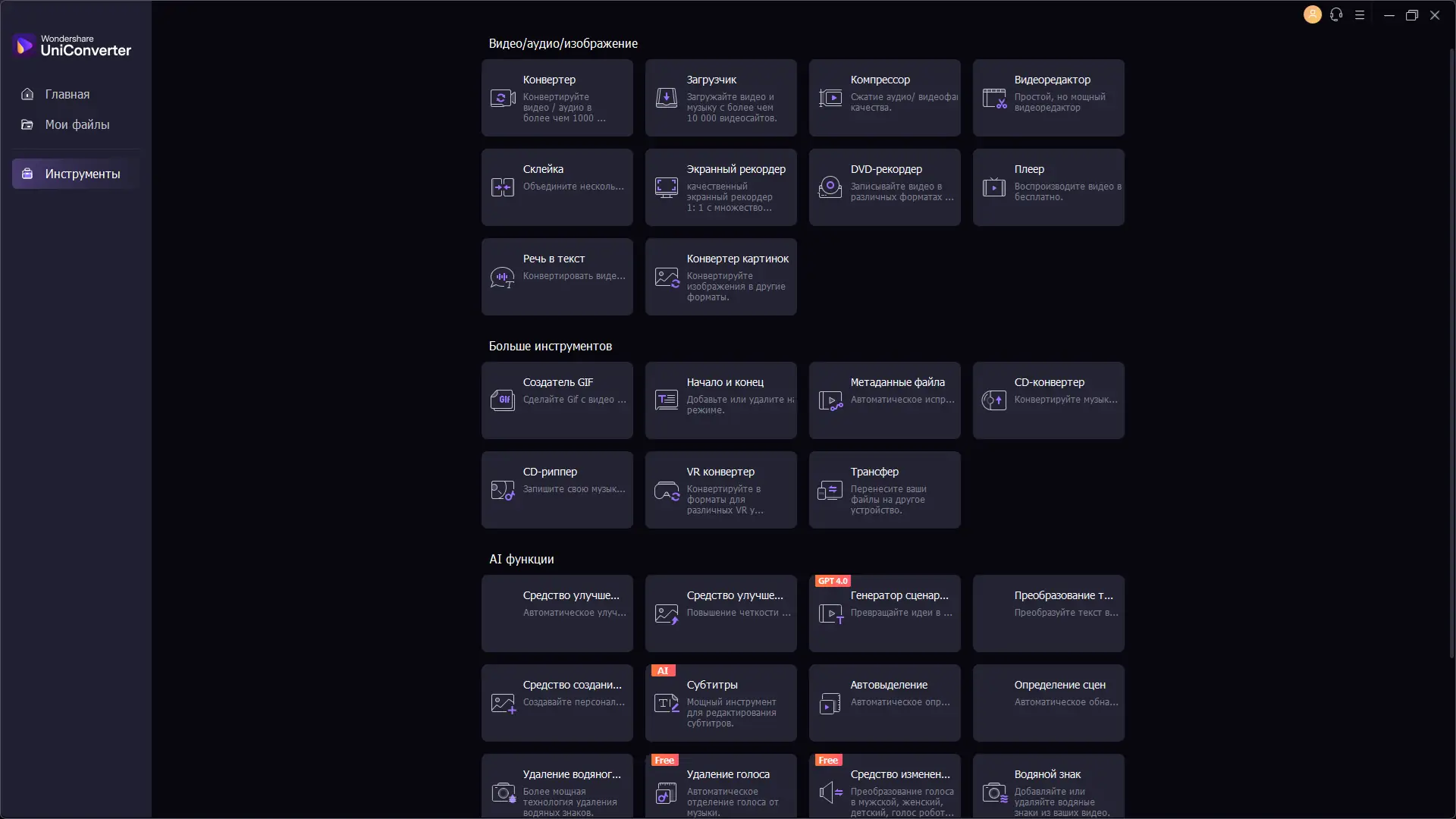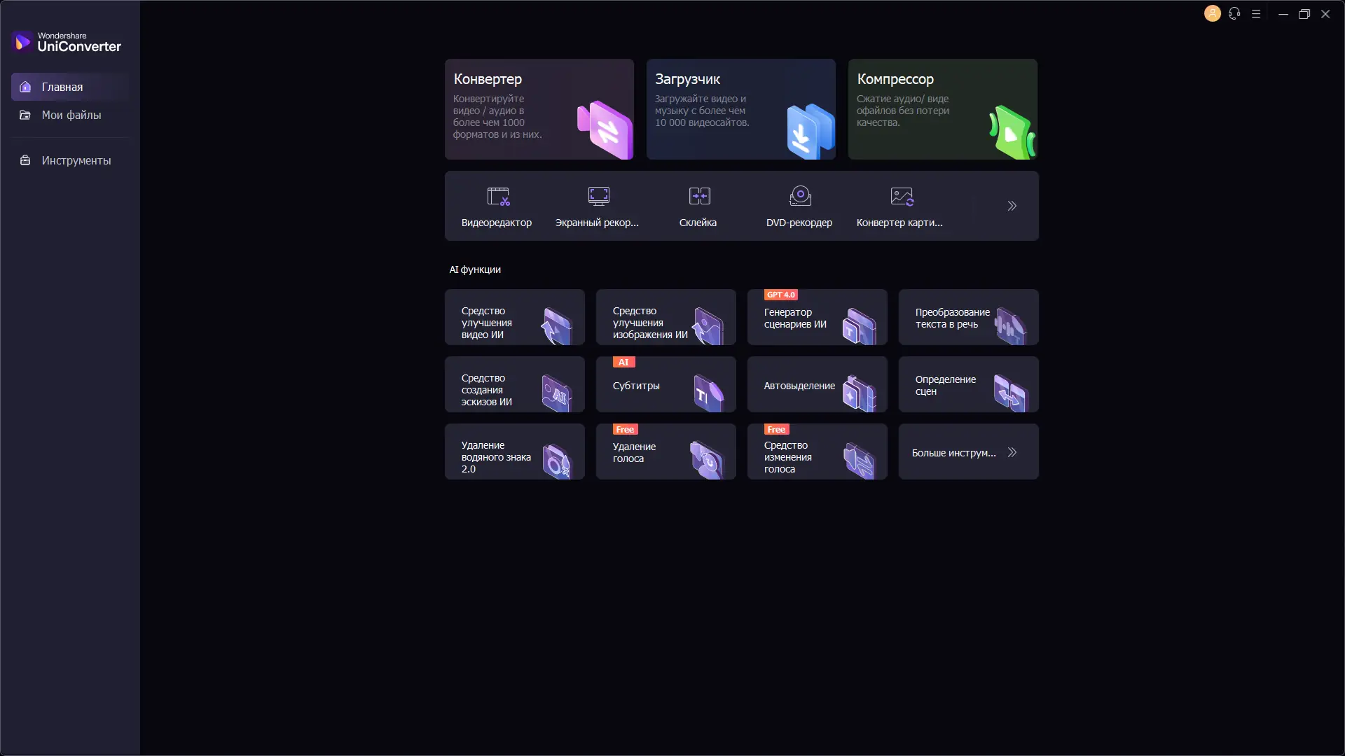 Wondershare UniConverter — универсальный инструмент для конвертации, редактирования и управления видео в более чем 159 форматах. Программа поддерживает работу с 4K, обеспечивает высокую скорость преобразования за счёт аппаратного ускорения и предлагает широкий набор функций: от создания DVD до скачивания контента с YouTube. Удобный интерфейс и поддержка русского языка делают её доступной как новичкам, так и профессионалам.