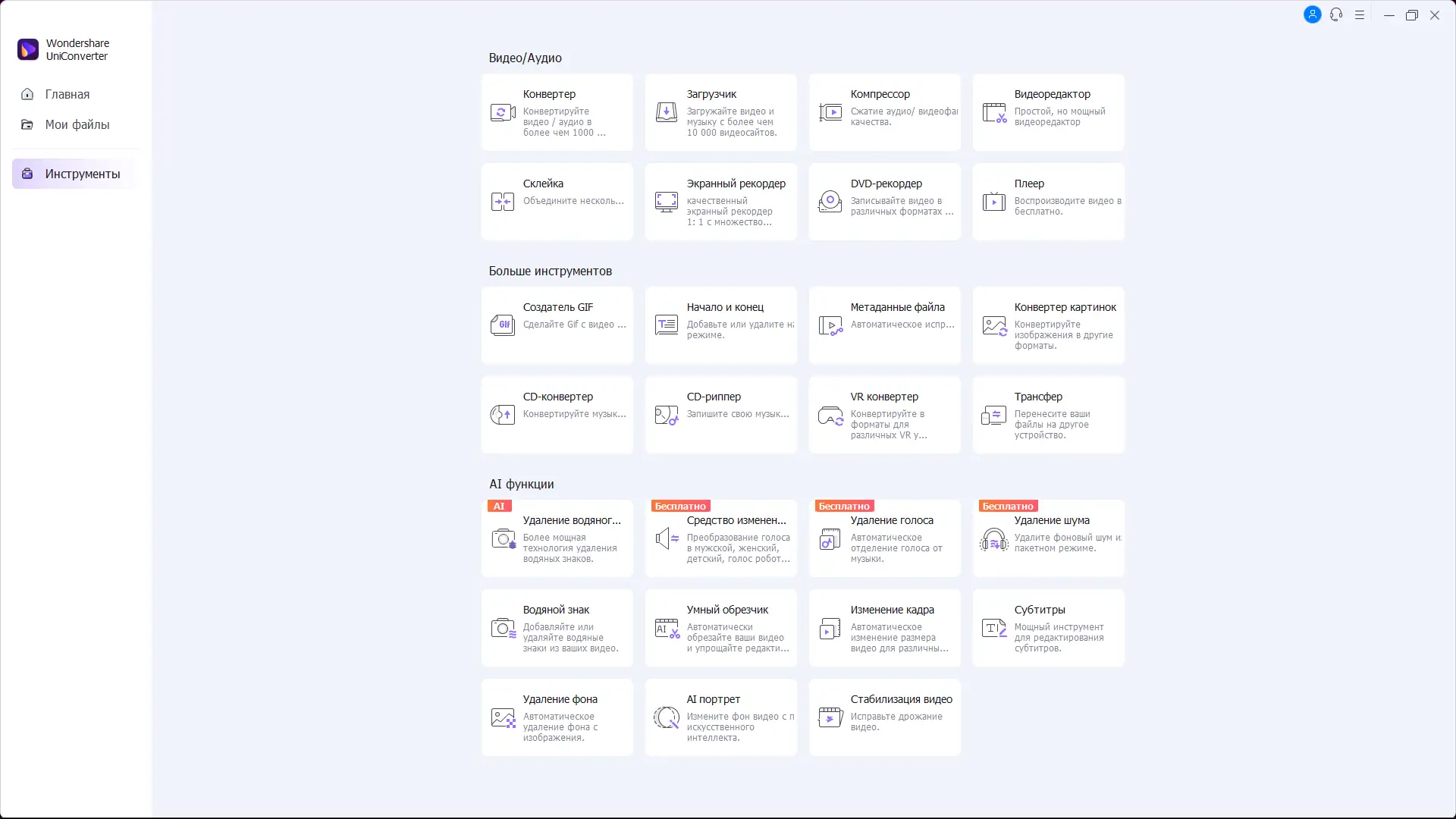 Wondershare UniConverter предлагает мощный набор инструментов для работы с мультимедиа, включая AI-функции, такие как удаление фонового шума, автоматическое кадрирование и редактирование портретов. Программа поддерживает создание GIF, исправление метаданных, конвертацию изображений и работу с VR-контентом. Портативная версия позволяет запускать приложение с флеш-накопителя без установки, не оставляя следов в системе. Однако из-за большого объёма функций интерфейс может показаться перегруженным для новичков, а папка временных файлов со временем занимает значительное место на диске.