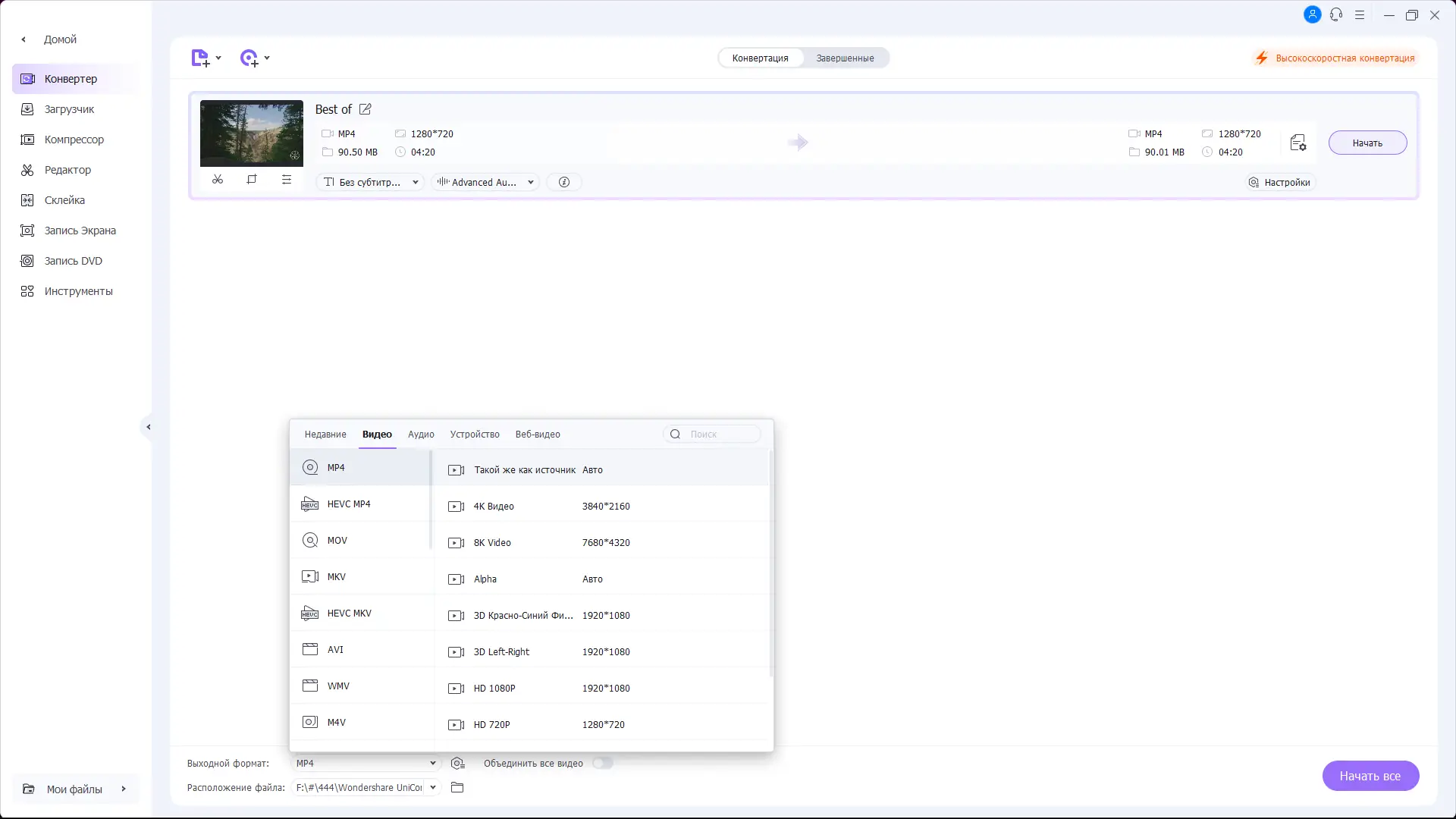 Wondershare UniConverter обеспечивает комплексное решение для обработки видео и аудио. Программа поддерживает работу с высококачественными видеоформатами, включая 4K и HEVC/H.265, что позволяет эффективно сжимать файлы без потери детализации. Благодаря аппаратному ускорению, конвертация происходит в десятки раз быстрее, чем в стандартных приложениях. Это особенно полезно при работе с большими объёмами данных, например, при подготовке контента для публикации или архивирования.