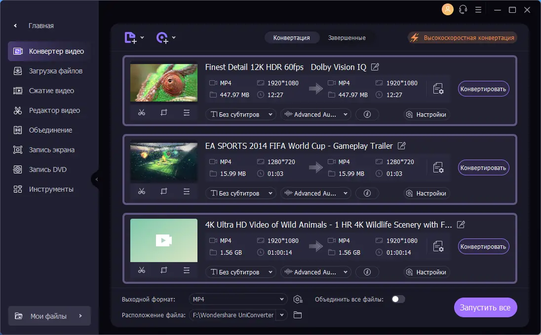 - Поддержка конвертации в более чем 1000 форматов с минимальной потерей качества.
