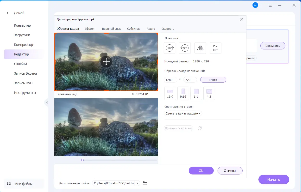 - Редактирование медиафайлов: обрезка, объединение, настройка яркости, контраста, громкости, добавление водяных знаков и субтитров.