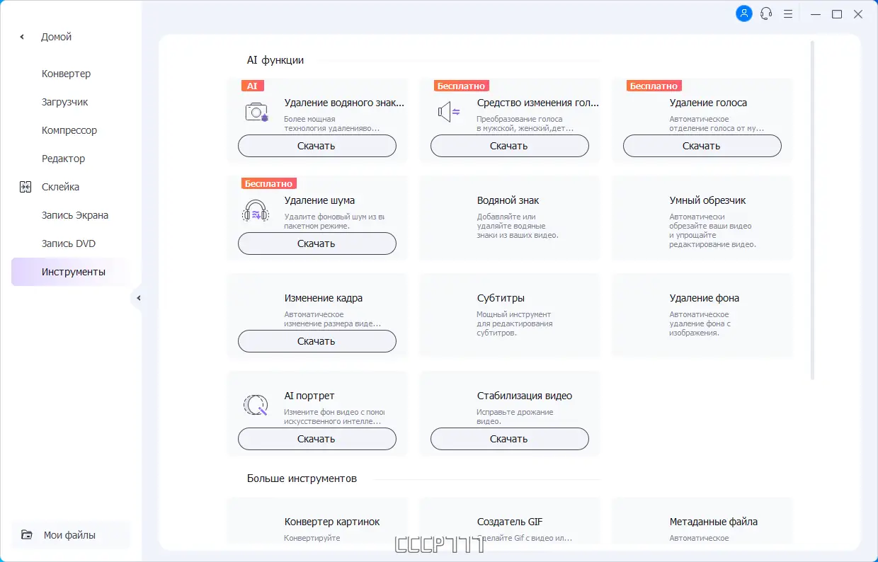 Wondershare UniConverter предлагает широкий набор инструментов, редко встречающихся в одном приложении. Особенно выделяется поддержка AI-функций, таких как автоматическое кадрирование, удаление фонового шума и фона, а также портретный режим искусственного интеллекта. Программа поддерживает создание GIF, исправление метаданных, конвертацию изображений и риппинг аудио с CD. Портативная версия не оставляет следов в системе, не требует установки и запускается на языке операционной системы. Функция аппаратного ускорения задействует GPU и многоядерные процессоры, что значительно ускоряет обработку. Тем не менее, из-за большого количества функций интерфейс может показаться перегруженным новичкам, а рабочие папки могут занимать значительное место на диске.